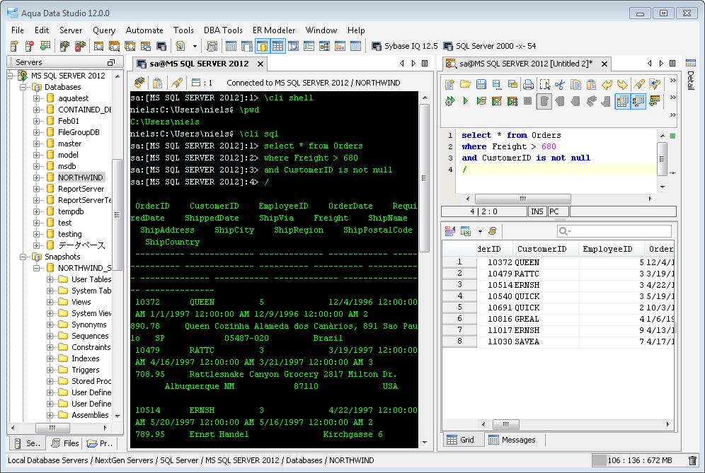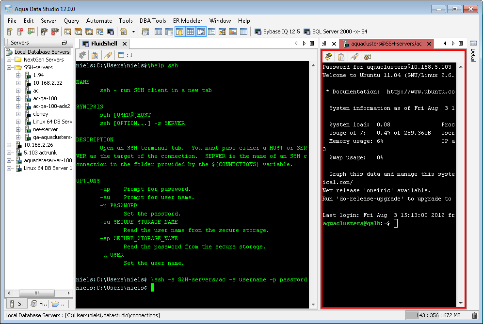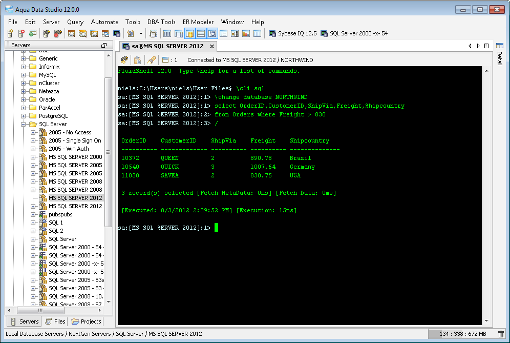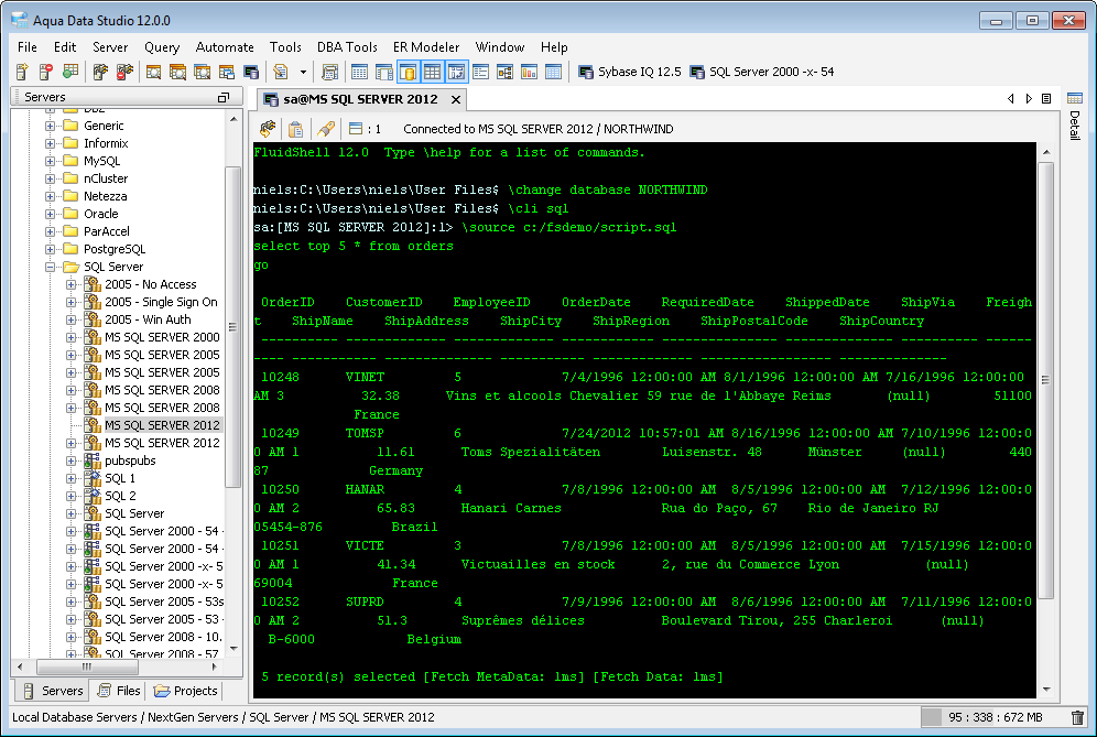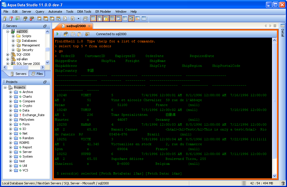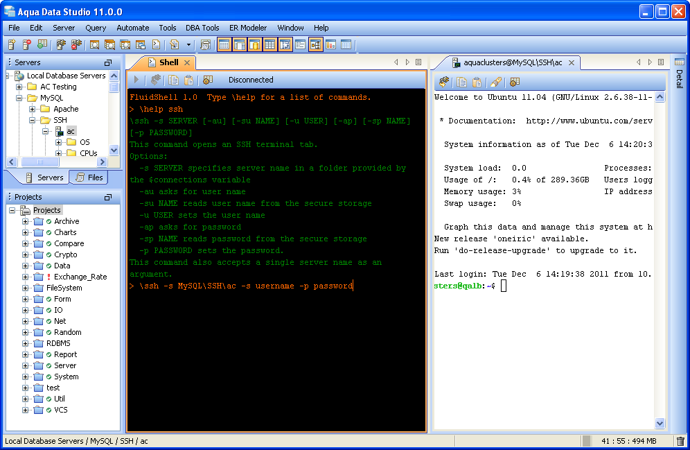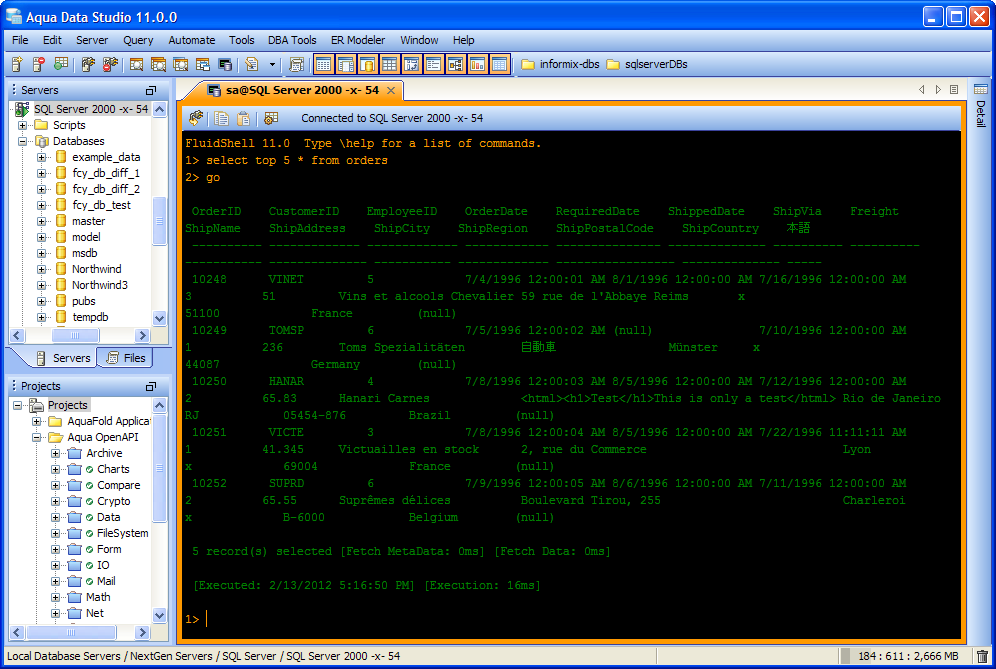 Aqua Data Studio now includes an integrated shell named FluidShell. FluidShell is an interactive database shell for all major database vendors which provides the combined functionality of a Unix Shell 1 with a SQL command line 2 tool. This combination of functionality grants users the power to automate the extraction, transformation and loading of data from within a single shell. FluidShell includes commands that match common Unix commands and functionality similar to most Unix shells such as variable substitution, alias commands, command substitution, input/output redirection, pipelines and command history. FluidShell can execute SQL scripts, shell scripts and AquaScripts to provide a diverse and flexible method to automate your daily tasks. Automate more and do more in less time.