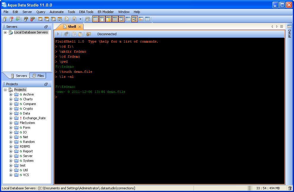 FluidShell includes a complete set of commands for quickly scripting and executing custom solutions for data mining, ETL operations, database/file system data exchange, data warehousing and other data processing tasks. FluidShell provides several popular Unix like commands and includes a large number of commands for shell terminal, database access, data manipulation, filesystem navigation, file and data archiving, network operations, and general utilities. See the complete list of FluidShell Commands.