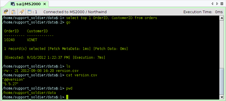 FluidShell presents users a smooth combined interface of the SQL command line and Unix command line by providing a highly configurable command line interpreter 6 which can be customized with shell variables or with the [cli] command. The [cli] command provides an easy way to change between a "sql", "shell" or "fluid" command line interface (CLI). The "fluid" CLI is configured to automatically determine whether the user is entering a shell command or a SQL command. If a SQL command is entered, the shell will add it to the SQL buffer while if it is a shell command, FluidShell will execute the command. To execute the SQL Buffer on the current connection a user may use the go command.