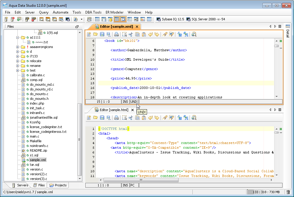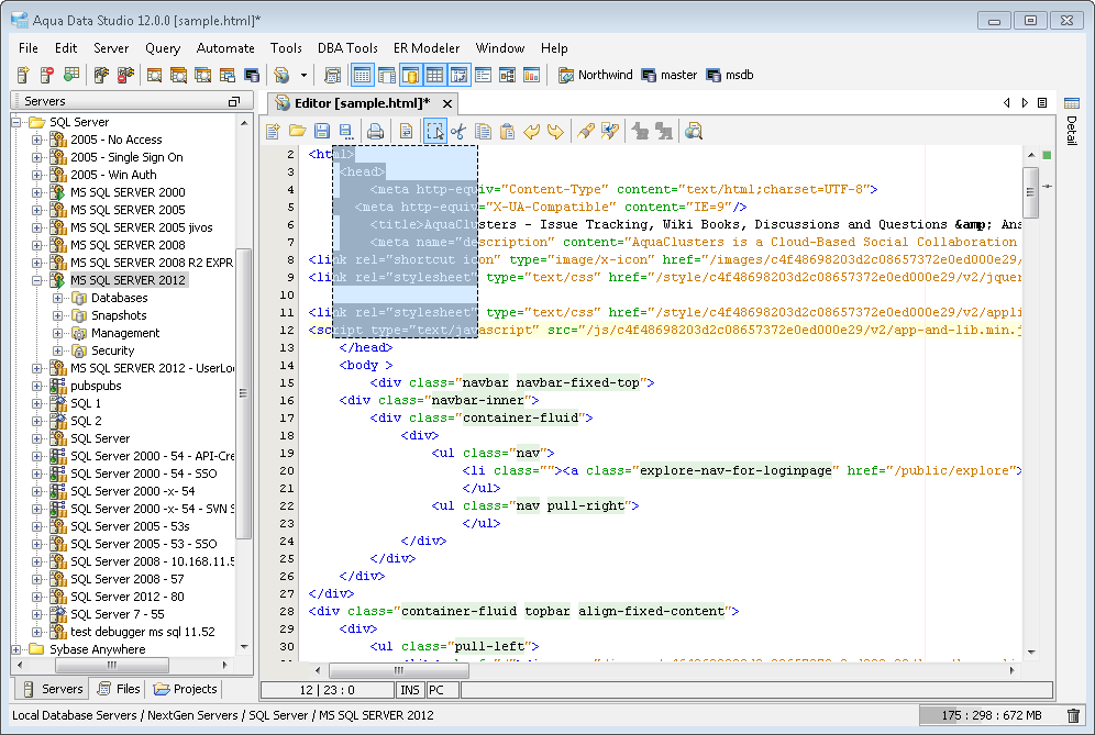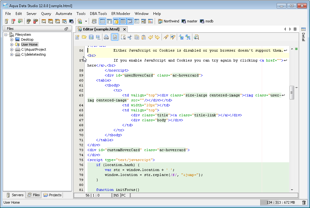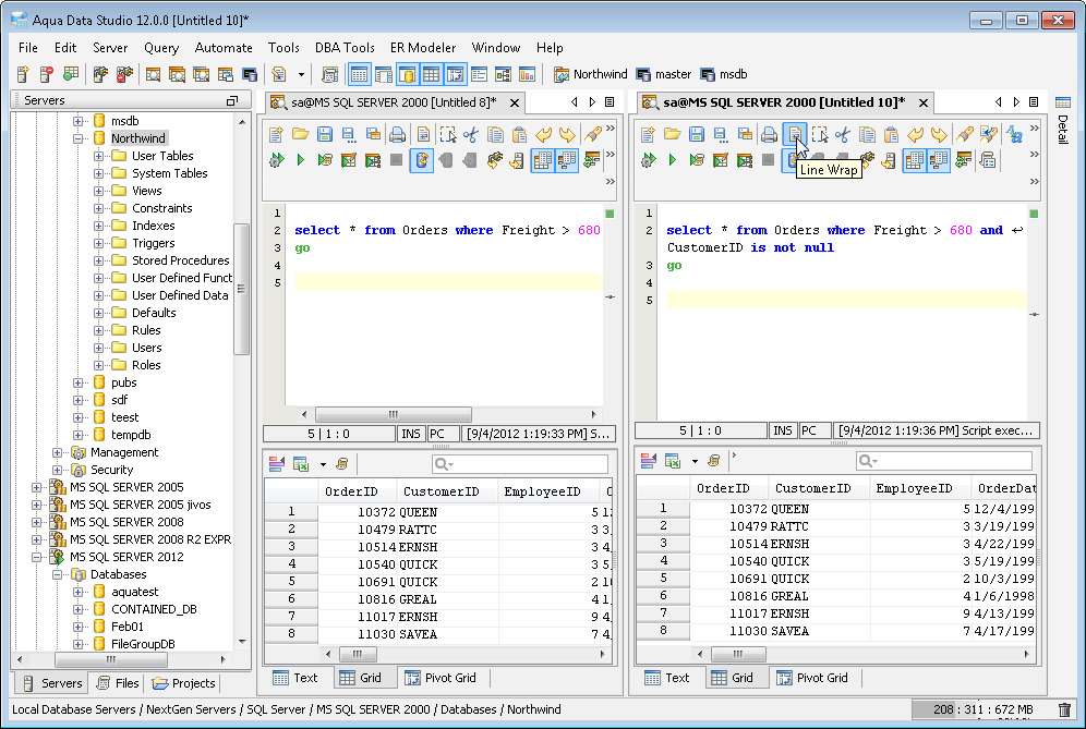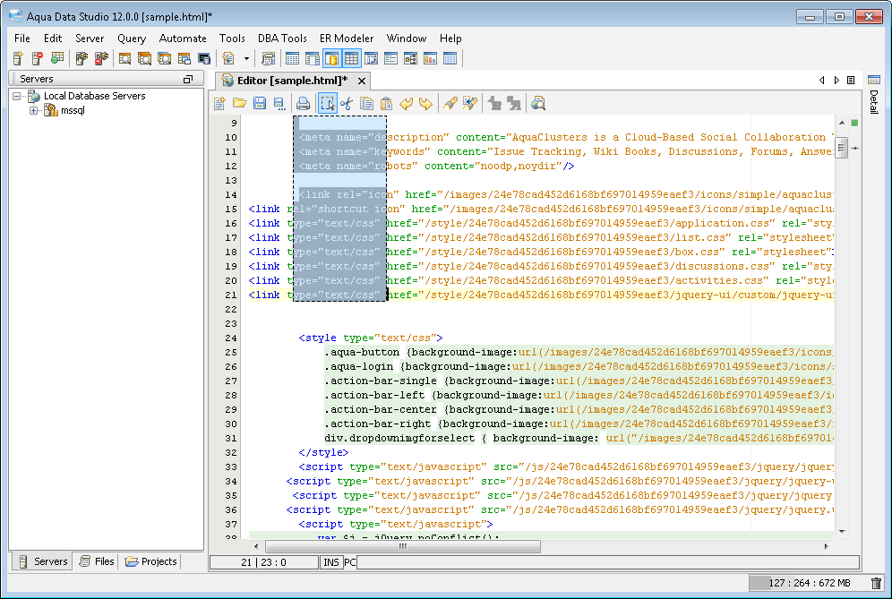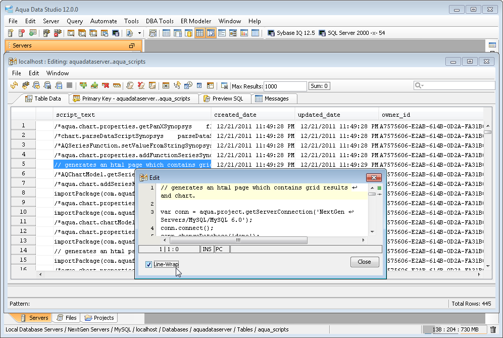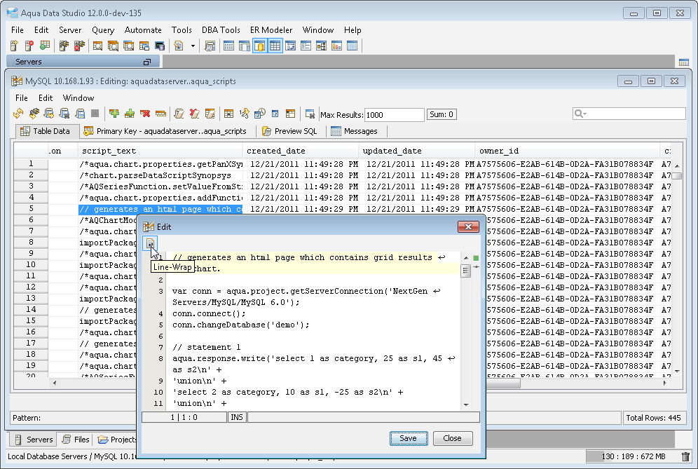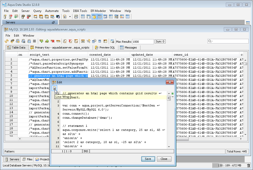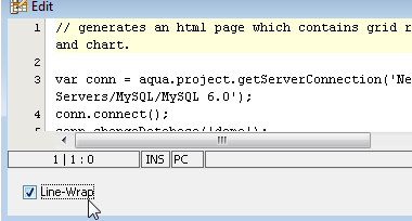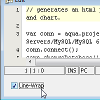 The Aqua Data Studio Editor continues to evolve and acquire enhancements found in the most modern editors. This new version includes line wrapping and line/block selection for better text manipulation. It also includes an enhanced status bar so users can better identify the cursor position, text selection sizes and the platform type of the files being edited.