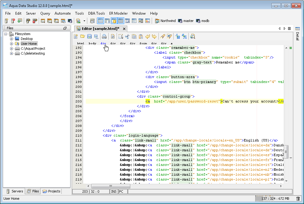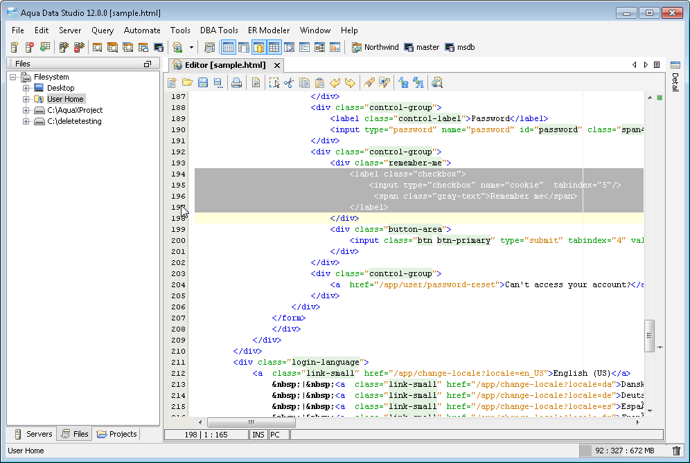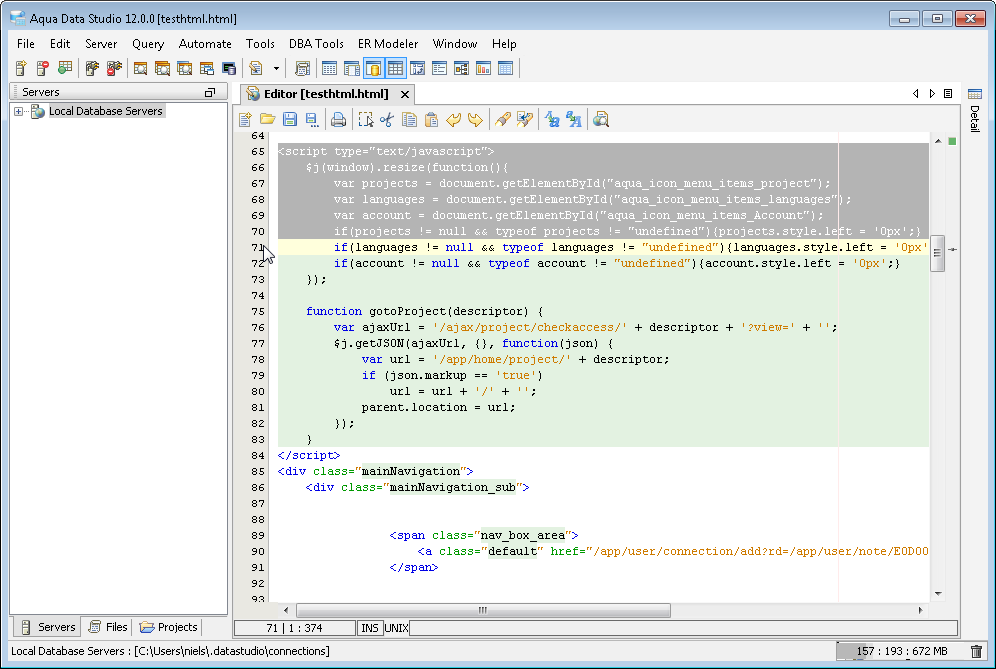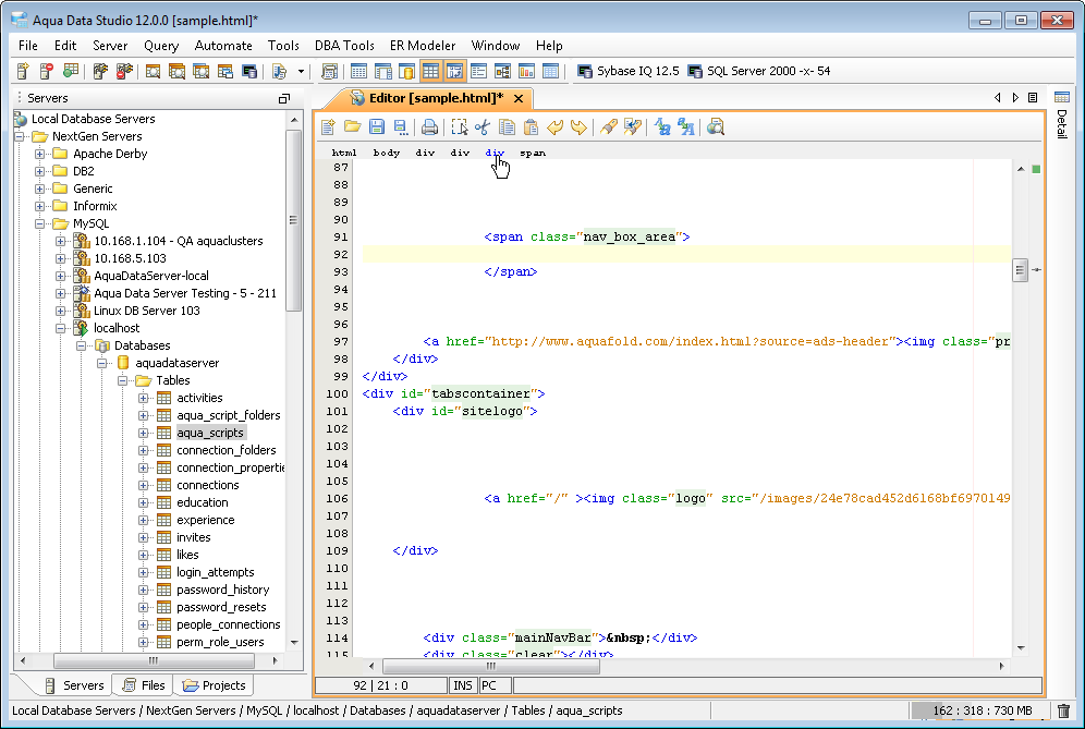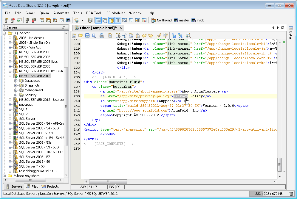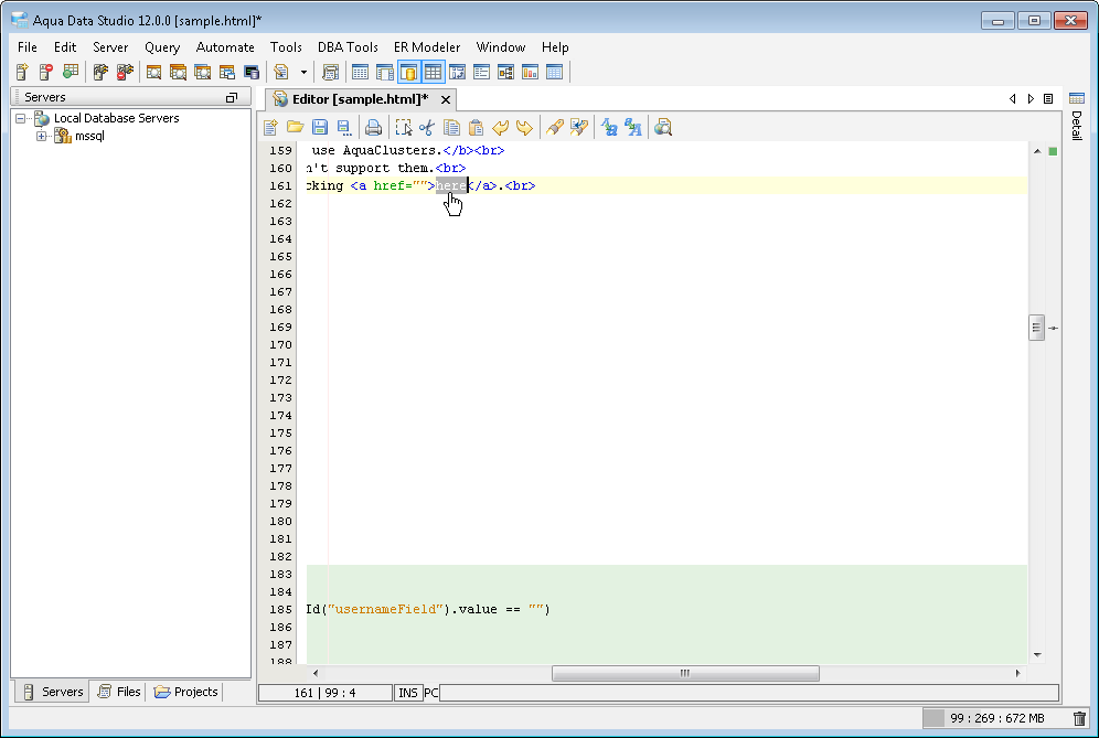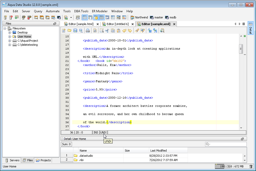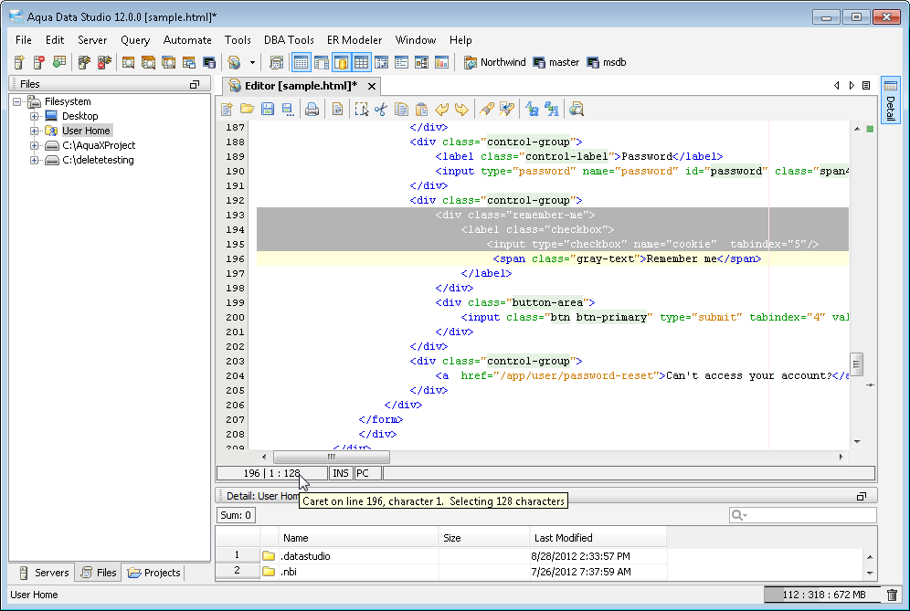 The Aqua Data Studio Editor continues to evolve and acquire enhancements found in the most modern editors. This new version includes line wrapping and line/block selection for better text manipulation. It also includes an enhanced status bar so users can better identify the cursor position, text selection sizes and the platform type of the files being edited.