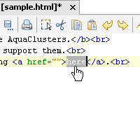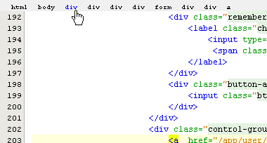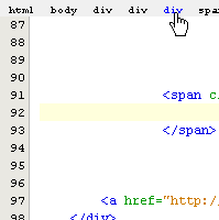 The top of the HTML editor displays the nested HTML elements based on the current cursor's position within the document. To quickly move your caret up the nested elements, click on a displayed element in the Breadcrumb Trail. The Breadcrumb Trail can be toggle on/off from File > Options > HTML Editor : HTML Tag Navigation Bar.
