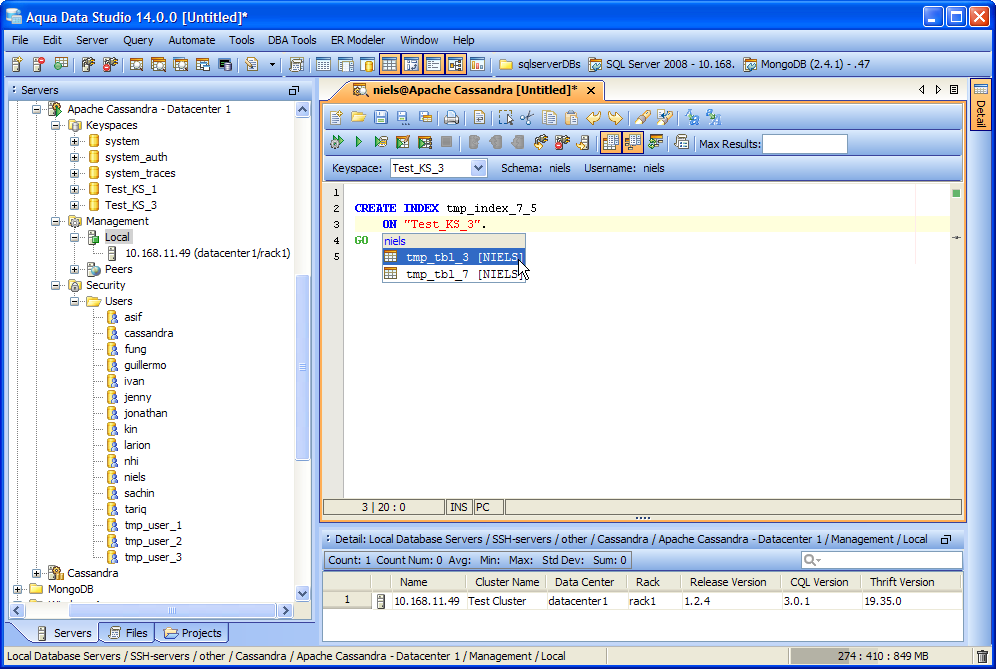 Use Open APIs to create fully automated end-to-end solutions for your Apache Cassandra databases using JavaScript. Aqua Data Studio provides a full-fledged IDE with APIs to Apache Cassandra database access, schema DDL generation, Grid and Pivot Grid charts, version control and much more.
