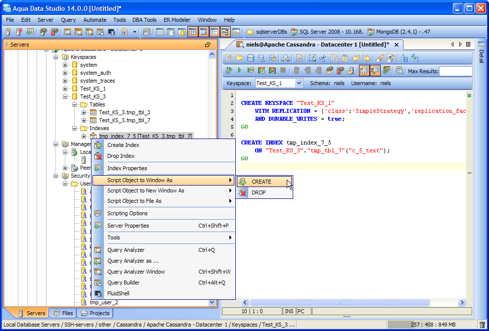 Rapidly generate SQL scripts for Apache Cassandra server objects such as Database, Tablespaces, Groups and Users. Script as a single file, or create an individual file per object into a folder.
