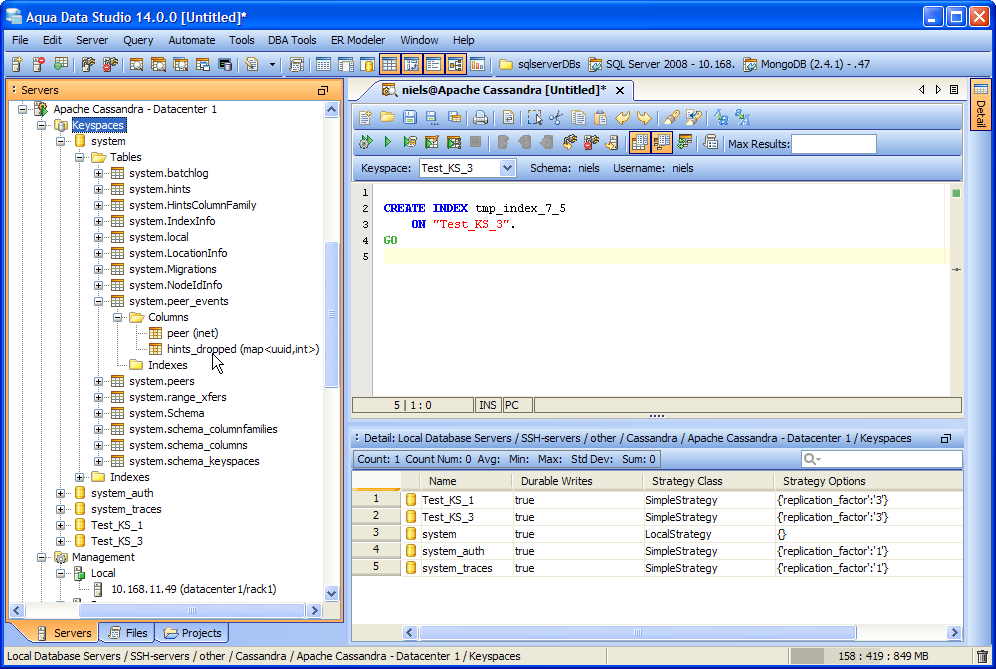 Aqua Data Studio now supports Apache Cassandra, giving you the ability to connect, query and generate results with Apache's Big Data warehousing system. With Aqua Data Studio 14.0, you can register an Apache Cassandra connection and use features such as the Visual Editors, Table Data Editor, Import / Export Tools, ER Modeler and Schema Script Generator.
