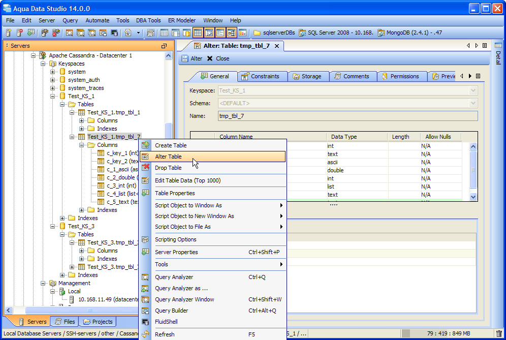 Rapidly create Apache Cassandra Databases, Schemas, Tables, Views, Functions and much more through Aqua Data Studio's highly streamlined Visual Editing UI. Alter and Drop objects just as easily.