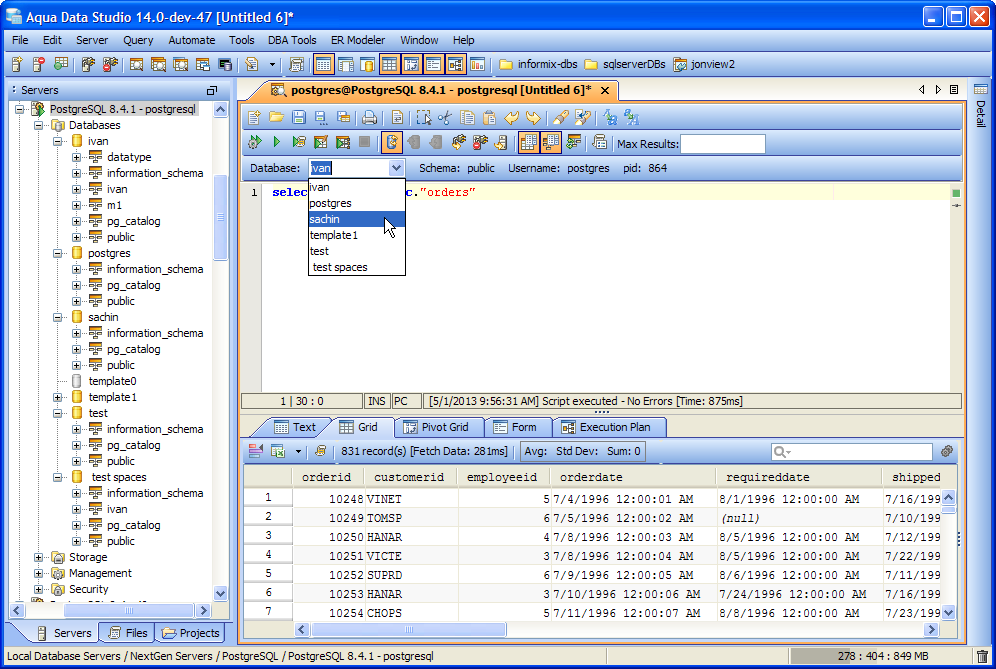 With Connection Clustering, you no longer need to register a separate server per database. Simply register your server, open a Query Analyzer and swap between all of that server's available databases with ease. The Schema Browser will also show you all of the databases on a server and allow you to expand their nodes, not just the one you indicated in the server connection properties. We've added this feature to all database servers that had this limitation including PostgreSQL, Teradata Aster, Greenplum, Netezza, ParAccel and SQL Database (Azure).