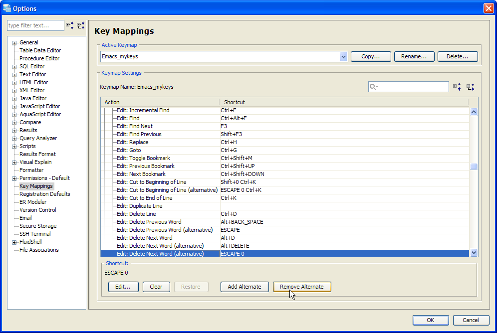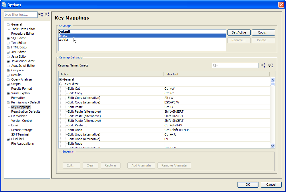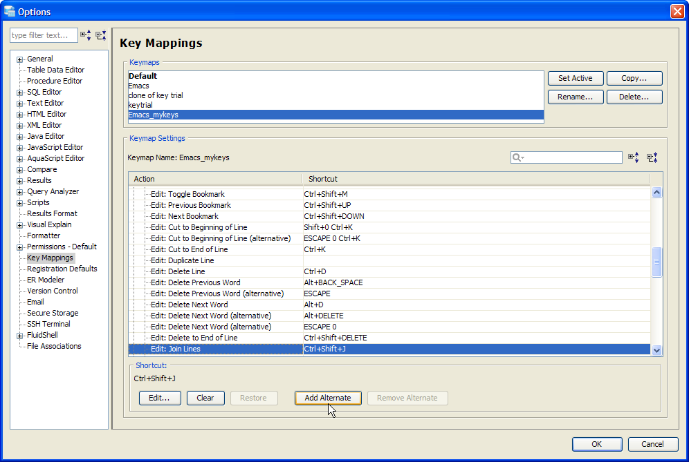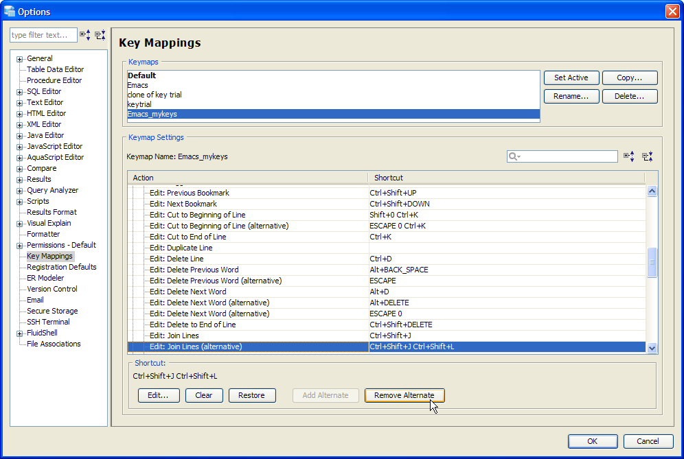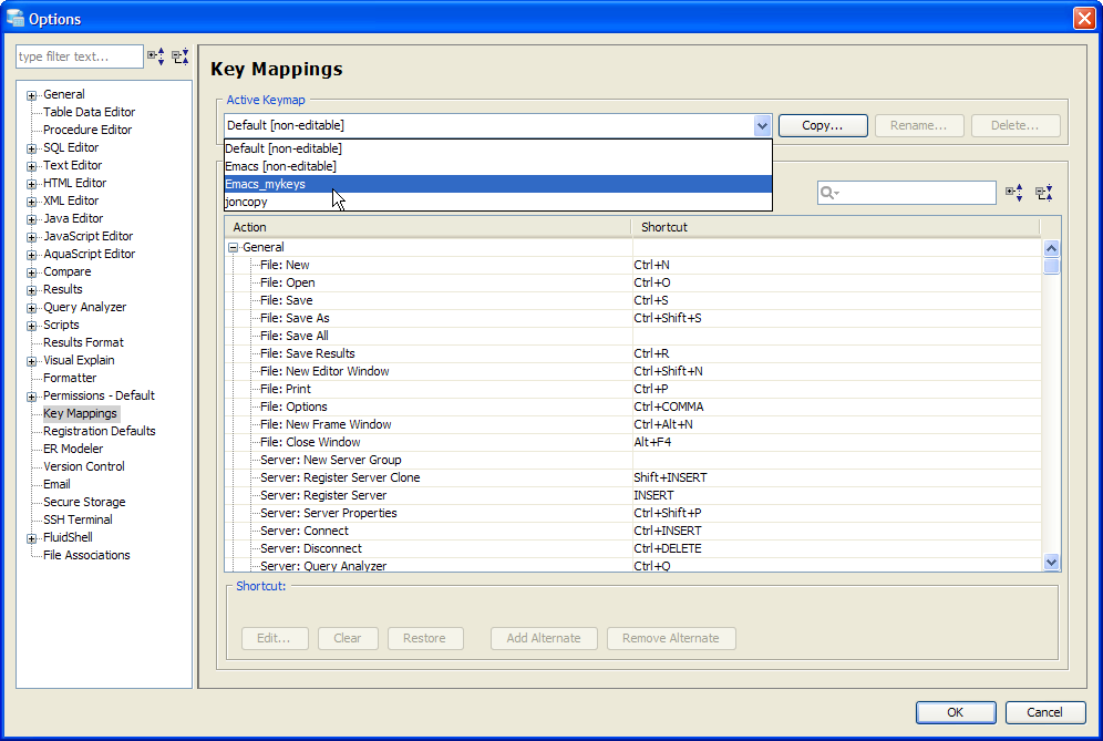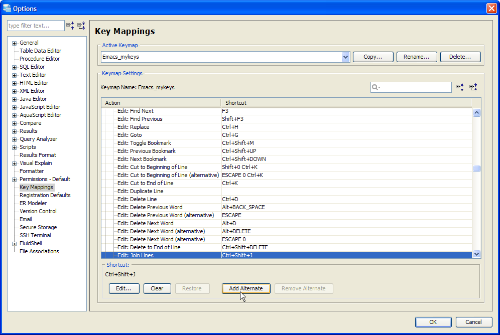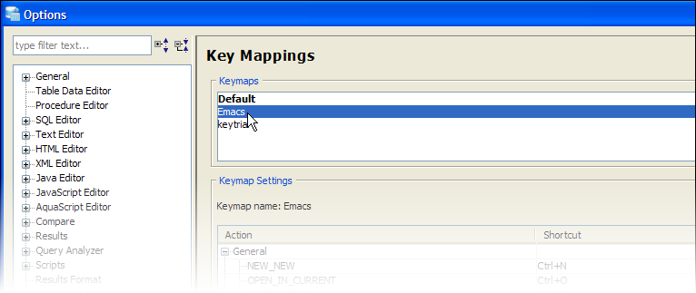 Configurable editor keybindings allow you to make Aqua Data Studio's editor keyboard shortcuts work exactly how you want. Out of the box, we've added Emacs key bindings along side our Default Key Mappings. If you go to File > Options > Key Mappings you can choose Emacs or any other key mapping you've already customized. If you want to modify Emacs settings to your tastes, simply make a copy of the built-in Emacs Key Mapping, rename the copy, then edit its shortcuts to your preferences. Launching Help > Key Assist will let you quickly see what your key bindings are without having to open File > Options.
