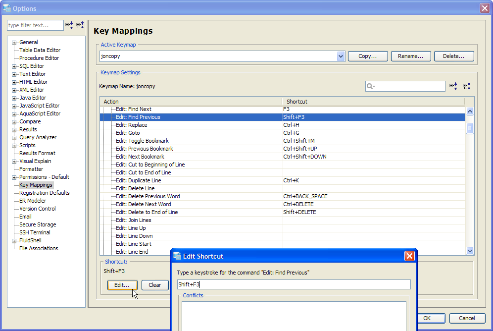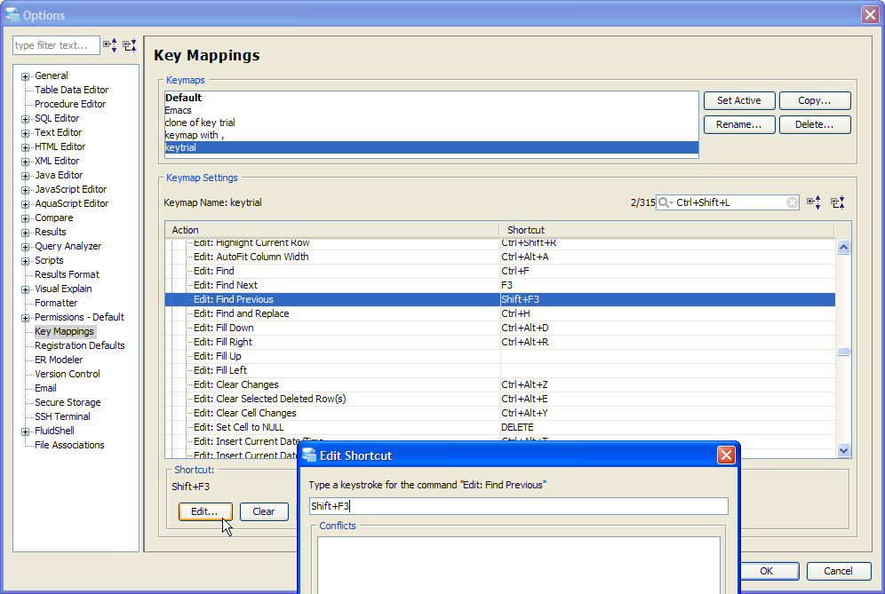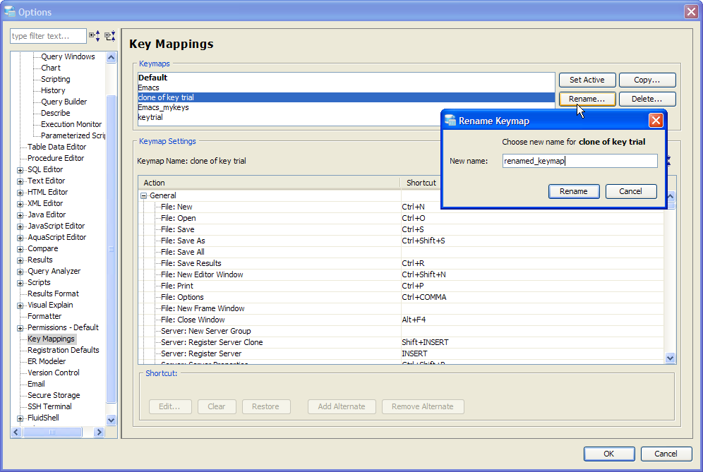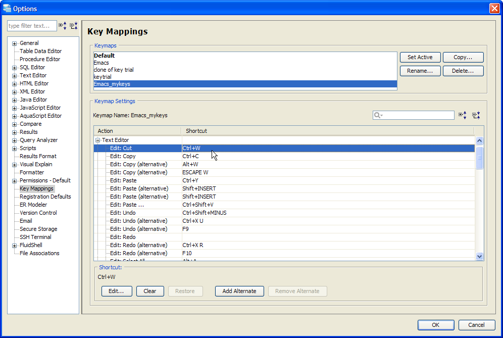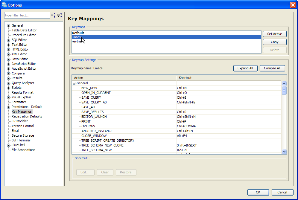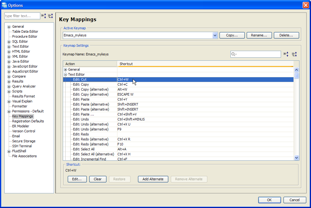 Configurable editor keybindings allow you to make Aqua Data Studio's editor keyboard shortcuts work exactly how you want. Out of the box, we've added Emacs key bindings along side our Default Key Mappings. If you go to File > Options > Key Mappings you can choose Emacs or any other key mapping you've already customized. If you want to modify Emacs settings to your tastes, simply make a copy of the built-in Emacs Key Mapping, rename the copy, then edit its shortcuts to your preferences. Launching Help > Key Assist will let you quickly see what your key bindings are without having to open File > Options.