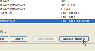 Quickly remove any alternate keybindings by clicking on them and clicking the Remove Alternate button at the bottom of the Key Mappings. Alternate keybindings are clearly labeled to make finding and removing them easy.