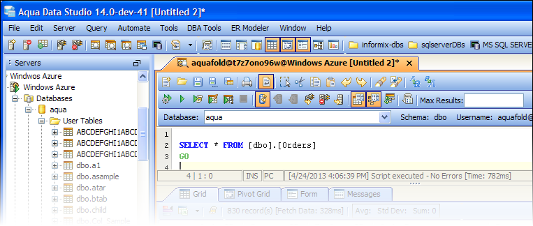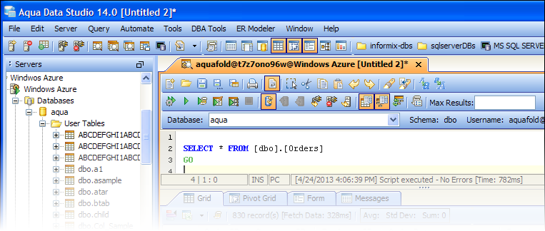 Add SQL Database (Azure) tables and columns, modify table constraints and even edit table storage parameters. Edit the data within a table using an excel-like grid via Aqua Data Studio's Table Data Editor. Using Query Builder, you can even create complex join statements without ever typing a line of SQL code, but still see the SQL Aqua Data Studio is generating for you.