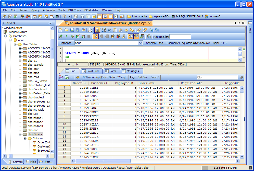 Use Open APIs to create fully automated end-to-end solutions for your SQL Database (Azure) databases using JavaScript. Aqua Data Studio provides a full-fledged IDE with APIs to SQL Database (Azure) database access, schema DDL generation, Grid and Pivot Grid charts, version control and much more.