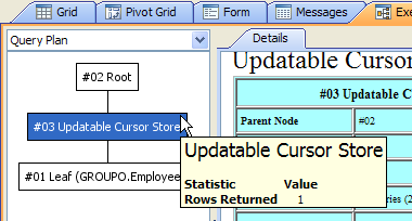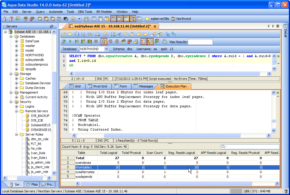 There are two options for the Sybase ASE Explain plan; XML and Text. The XML option presents the Explain in diagram form with associated details in the Details, XML and Advanced tabs. The Text option presents the Explain Plan as text with an associated sortable grid with information on Total Logical Reads, Total Physical Reads, Scan Count, Regular Reads Logical, APF Reads Logical, Regular Reads Physical, APF Reads Physical and APF IOs.