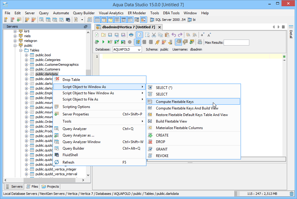 Vertica 7 is supported, allowing you to script Flextable objects from the Schema Browser like CREATE FLEX TABLE, Restore Flextable Default Keys Table and View, and Compute Flextable Keys. Explain Plans are supported and you can also view Fault Groups in the Management node.