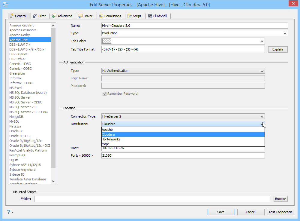 We now allow you to use your MapR, Cloudera and Hortonworks jdbc drivers to access more Hive distribution specific features. Choose your distribution in the Server Properties dialog when registering a new Hive server.