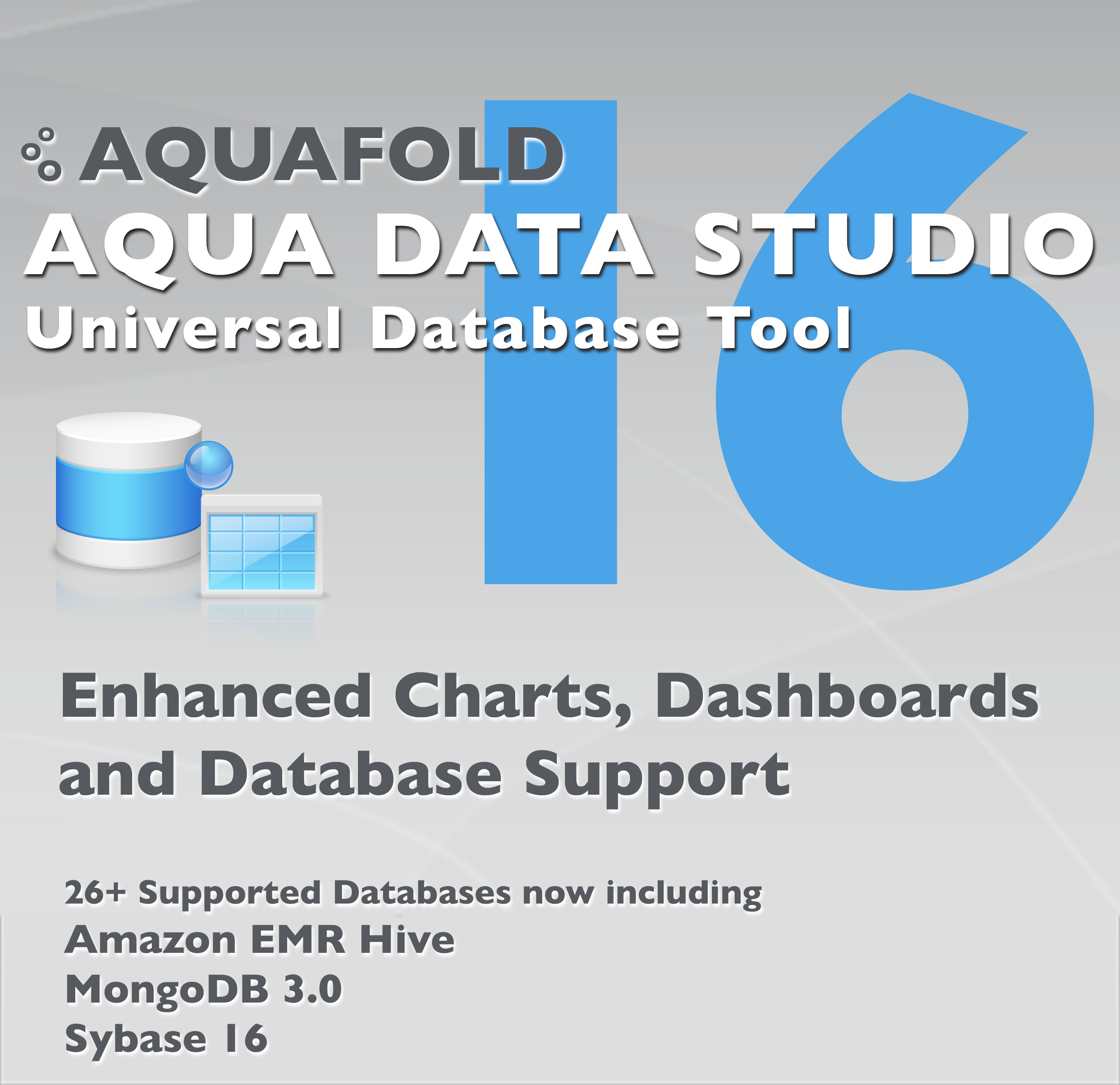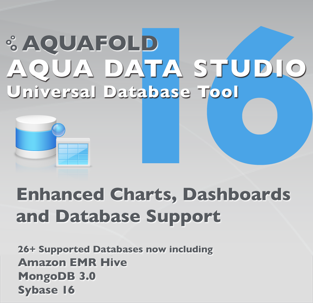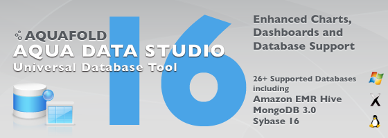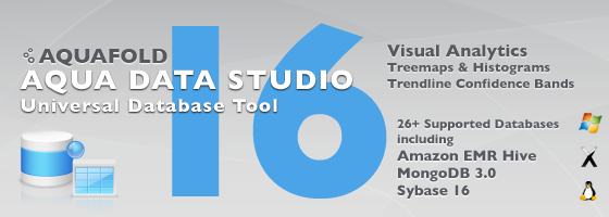 For the Aqua Data Studio v16.0 release, we are dramatically enhancing Visual Analytics, giving you more charts, features, capabilities and options to produce the data visualizations you need. We've introduced a new chart type called Treemap. There are more options for Trend Lines. You can create Bins to group ranges of continuous measure values to create Histograms. Quickly copy spreadsheet content and paste it in as a datasource with Paste Data. An Undo/Redo framework is now available in Visual Analytics. You can pin Query Analyzer results so they do not get cleared after query reexecution. DB2 z/OS versions 9 and higher now allow displaying Visual Explain Plans. Our FluidShell can now share sessions with the Query Analyzer. We're including support for newer versions of databases we already supported: Sybase ASE, Sybase Anywhere, SQL Server, MongoDB, VoltDB, Greenplum, Vertica, Hortonworks, Cloudera, Teradata, Netezza, ParAccel, Informix, and Apache Derby.