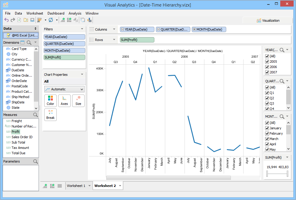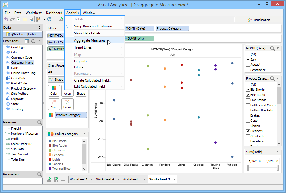 Disaggregating measures is a new enhancement that enables you to analyze data by plotting your underlying data values. For example, your company made a profit of $3,356 on the Wheels product in the month of July. On disaggregating measures, you can see the distribution of individual sales, and analyze whether your product incurred losses during this period .