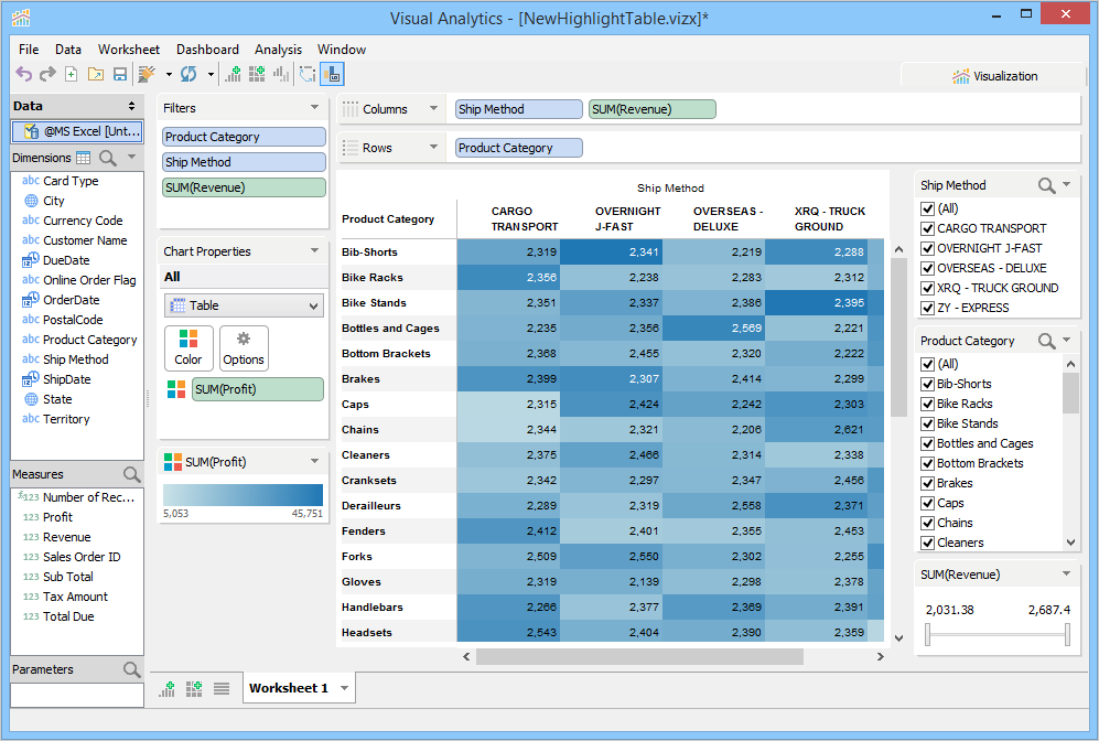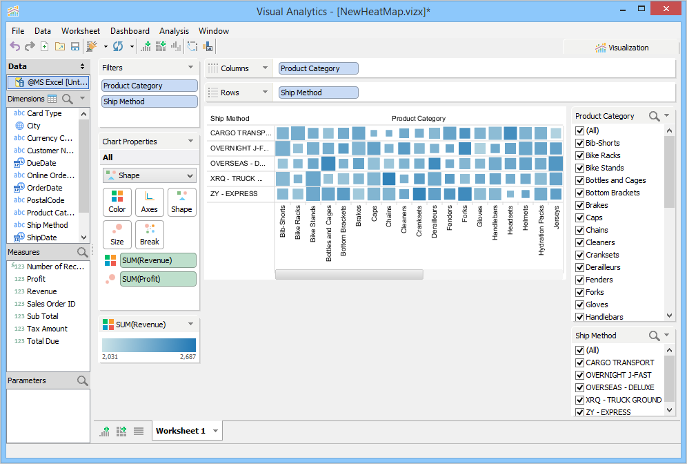 The heat map visualization gives you an easy view to analyze data by displaying measure values in varying size and color gradients. For example, you can analyze revenue (in color) and profit (in square size) for your products, based on the shipping method.