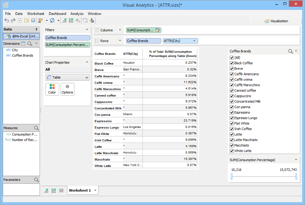 The attribute function helps you to identify unique values by answering the question "Does every row have the same value?" If yes, return that value. Otherwise, return *. For example, in our data set, only the people in the city of Houston consume Black Coffee. Hence Visual Analytics returns Houston as a unique record for this brand. On the other hand, people in multiple cities consume Cappuccino. Hence Visual Analytics returns * for this brand.