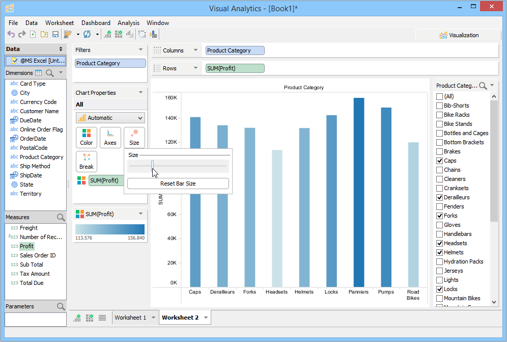 The new Size deck in Bar charts lets you assign different sizes to each bar by placing a measure field in the size deck. Additionally, the Size slider allows you to make the bars wider or narrower. We've also added the Size deck in line charts which enables you to make the lines thicker or thinner.