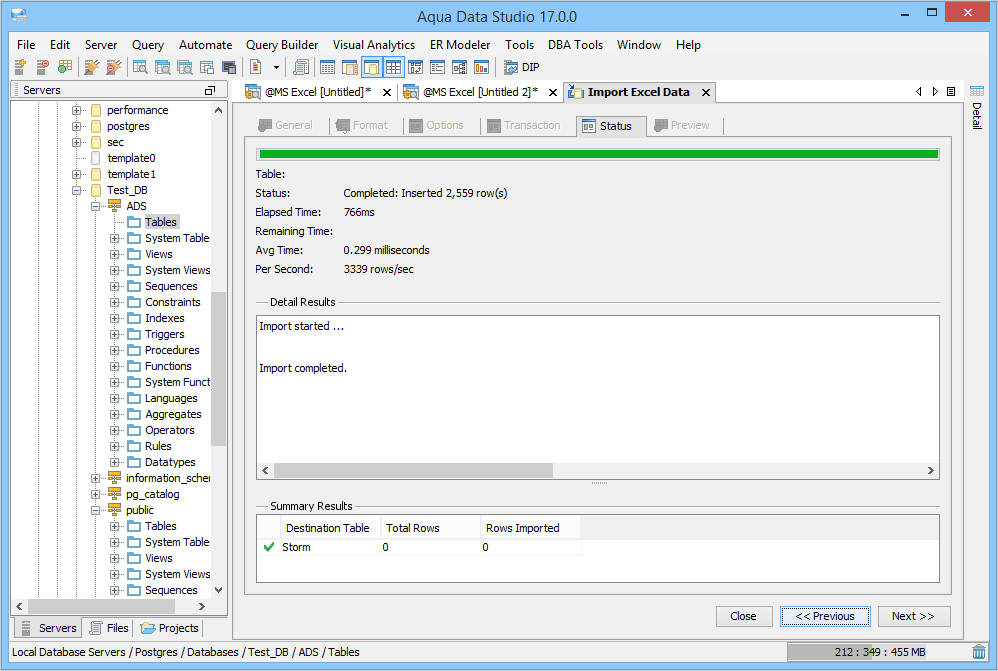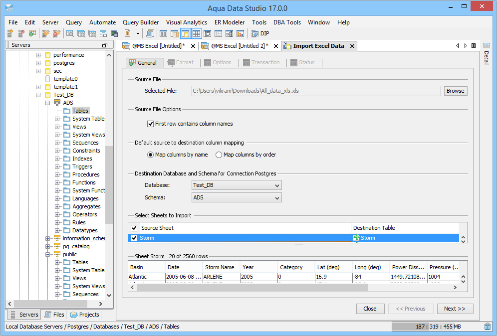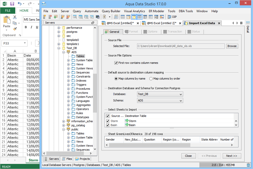 Aqua Data Studio Version 17.0 offers you a tool that simplifies your data import. The new Excel Import tool imports data directly from single or multiple Excel sheets into existing or new database tables. There is no longer a need to first export your Excel data into csv format and then import one csv file at a time. The Excel import tool also examines your Excel file and automatically generates intelligent data mappings. Excel Import supports both .xls and .xlsx formats and works with all 26 databases that Aqua Data Studio supports.