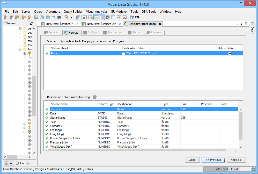 Aqua Data Studio allows you a great degree of flexibility in defining your column mappings. For new destination tables you may change the destination column names and data type or, for full flexibility, launch our table creator UI. For existing tables you may specify whether to delete existing data prior to starting the import. For all tables you choose the columns to import, the columns to ignore and the mapping between source and destination columns.