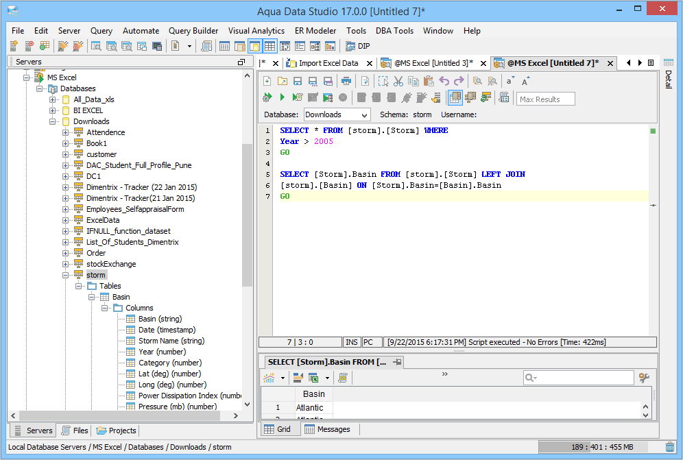One of the most popular features requested by our ExcelSQL users is to offer support for WHERE clause. Aqua Data Studio Version 17.0 has enhanced our ExcelSQL syntax to support WHERE, ORDER BY, GROUP BY, HAVING, and JOIN clauses. You can register a Microsoft Excel connection to a directory containing Excel files and use features such as Query Analyzer, Query Builder and Visual Analytics to connect, query, and generate results from XLS and XLSX files. View our Excel SQL Query Reference.