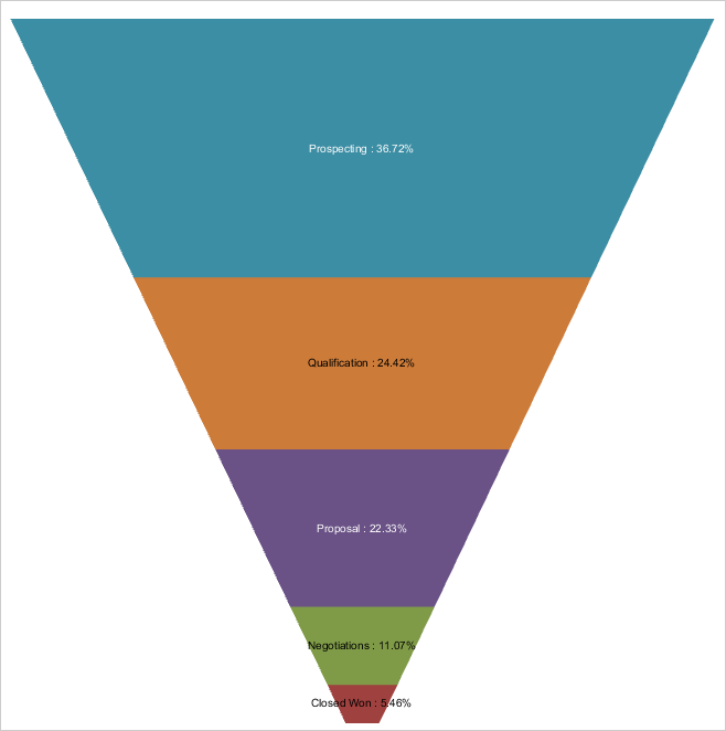 With the introduction of funnel charts, you can easily view the relative performance of various stages of a process. Funnel charts are commonly used for representing the different stages in a sales process and presenting the potential revenue for each stage. The following example shows you the sales pipeline for an organization.