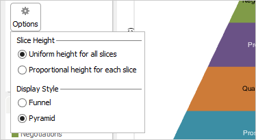 Visual Analytics can present your data in two distinct styles. The funnel display is the default style. The other style is the pyramid display. It is similar to a funnel display style but has an inverted funnel.