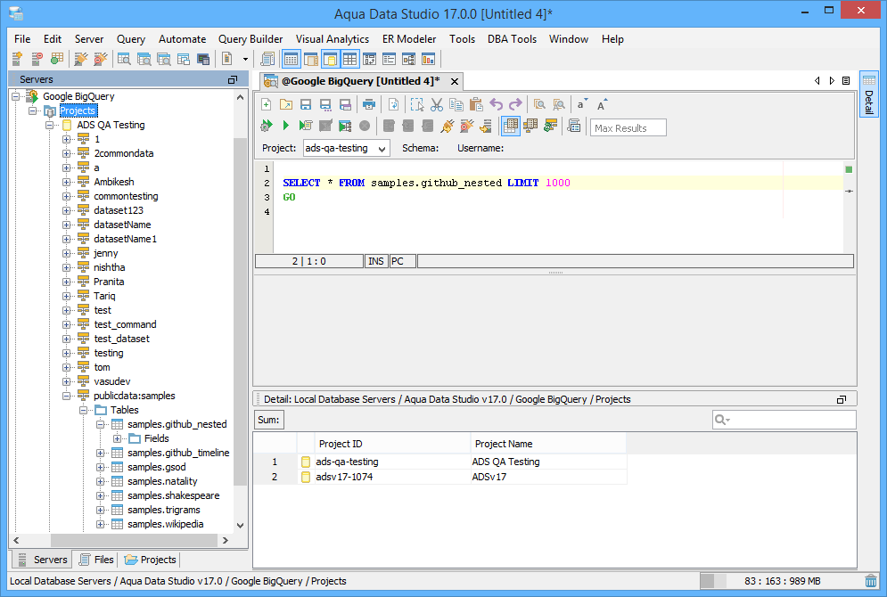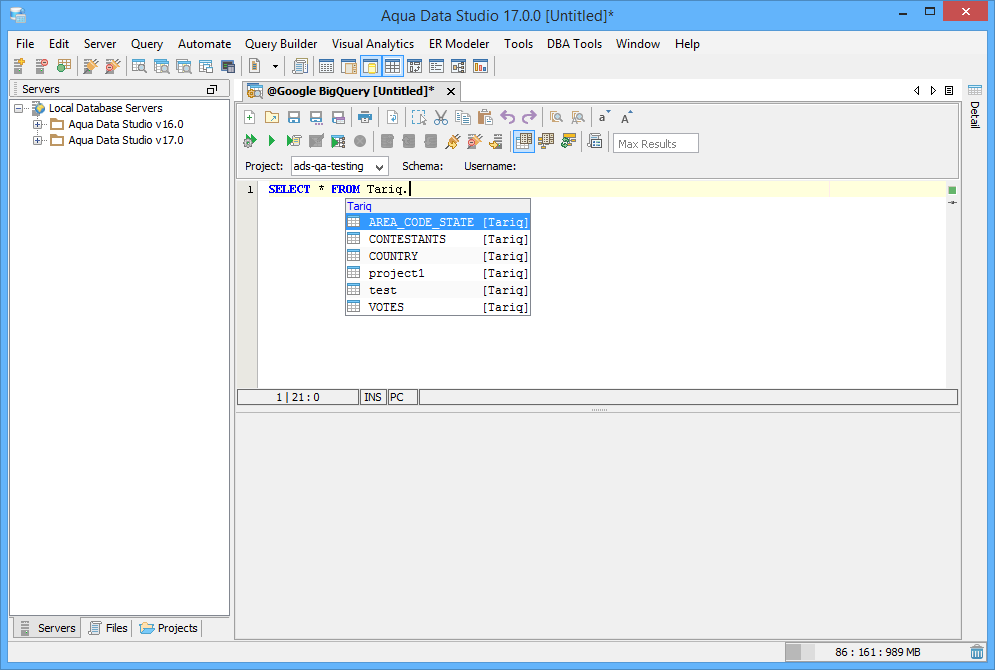 Sign up for BigQuery and create your Projects. Launch the Register Server dialog and create a native connection to Google BigQuery using the standard Google Authentication. Use Aqua Data Studio to access your data using the Query Analyzer. Easily browse or create tables, run queries, import/export data to Google Cloud Storage, and perform querying and scripting tasks in our tool.