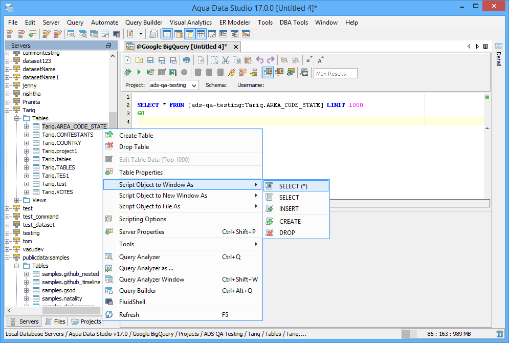 Script a BigQuery object as SELECT, INSERT, CREATE or DROP to have Aqua Data Studio generate DML and DDL statements. With the Schema Script Generator, you can either choose objects to script or script the complete content of a Dataset.