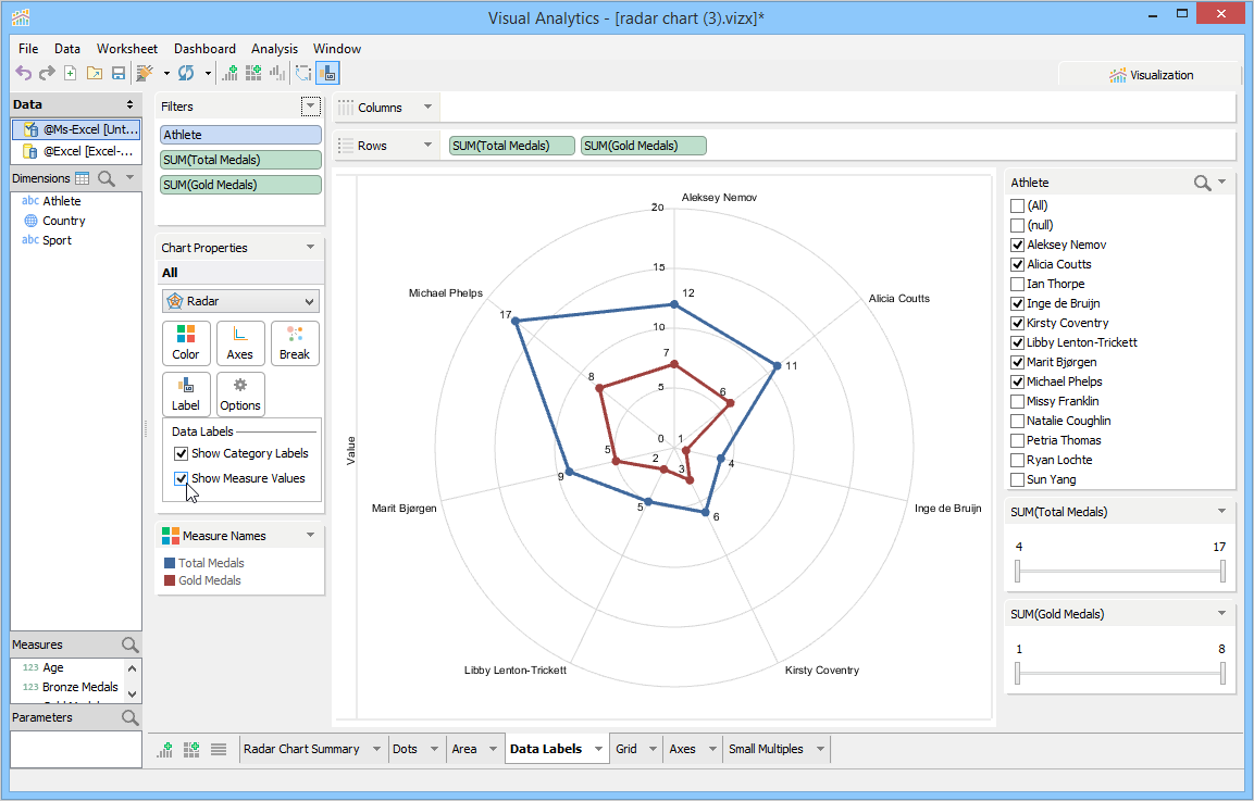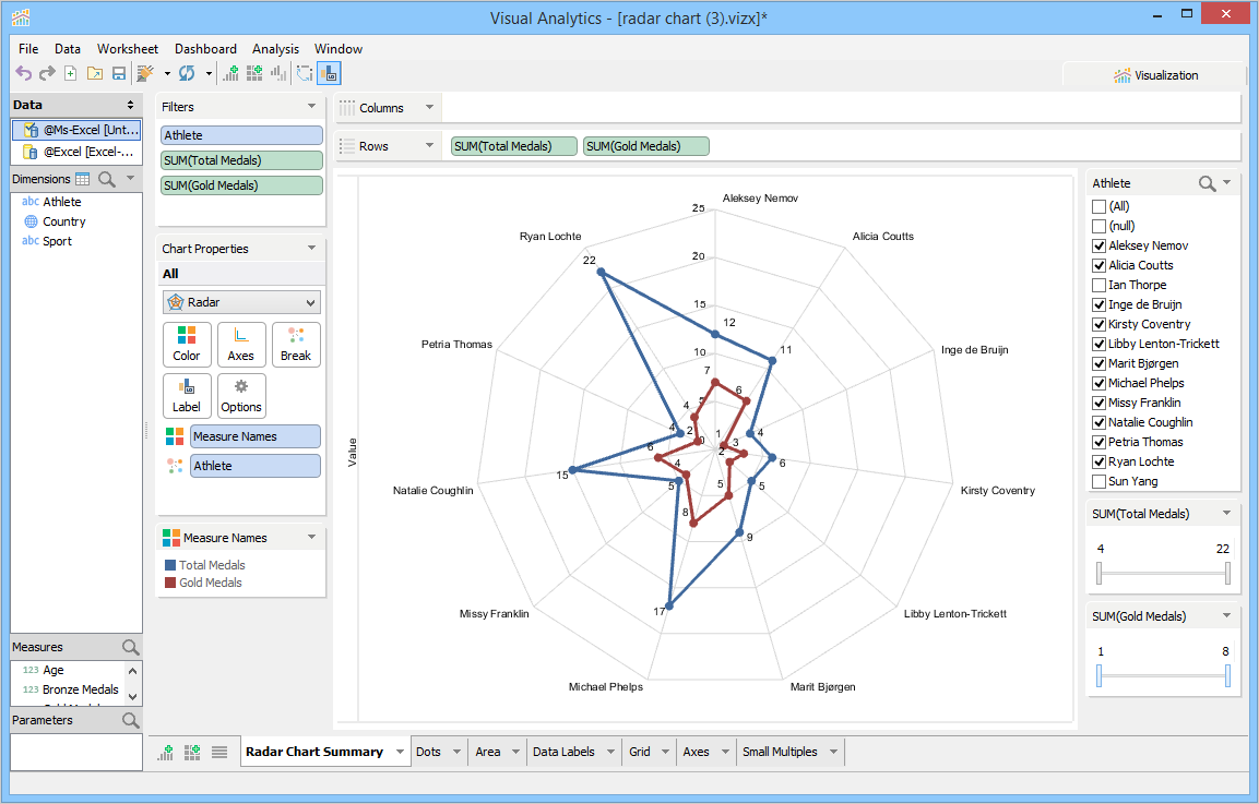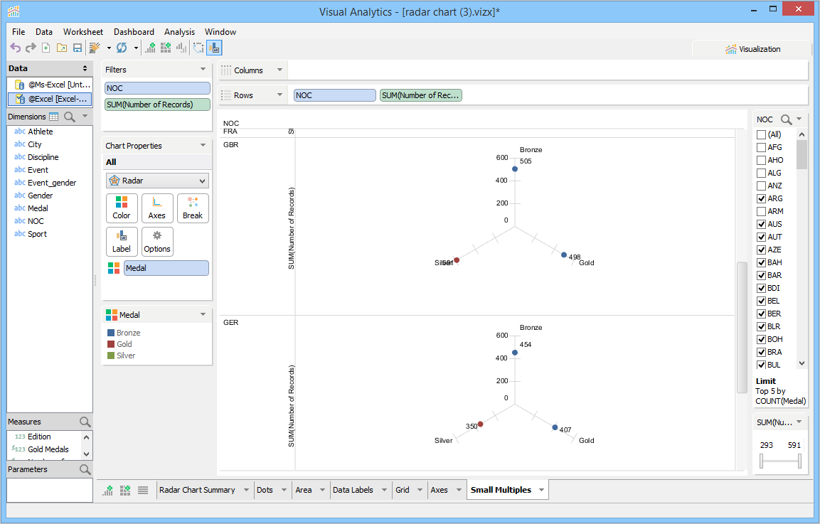Visual Analytics can create small multiples of the radar chart in a single view and thus enables you to compare different data points at the same time.