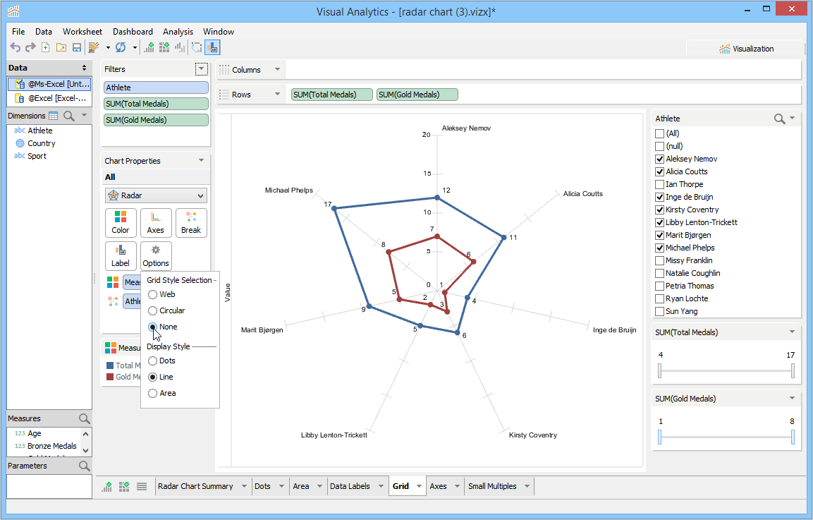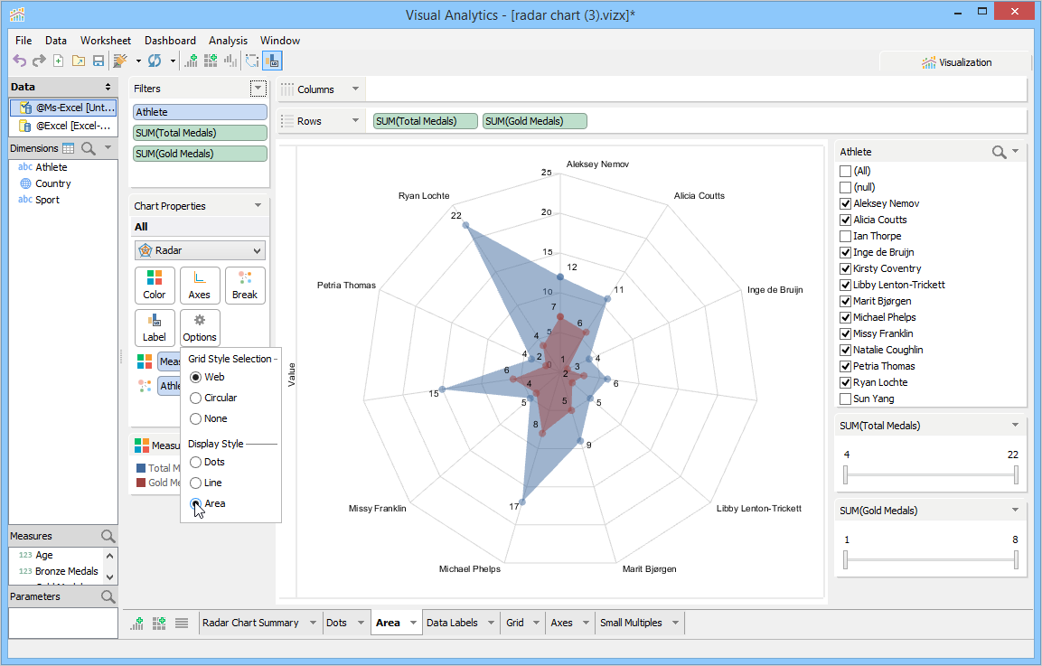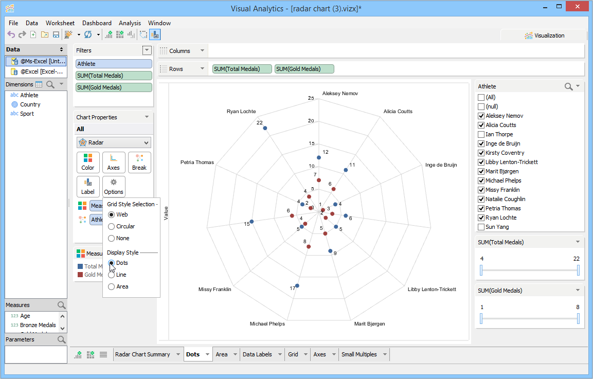 The radar chart can present your data in three distinct styles. The line display is the default style. The other styles are dot and area display. The dot display style helps you to identify gaps or clusters of your data.