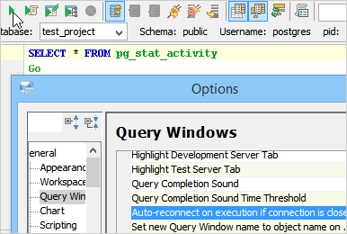 Auto-reconnect checks if your connection to Query Analyzer is still valid. If your connection is closed or severed, then auto-reconnect establishes a connection and sends the query to the server. Use File > Options > General > Query Windows to enable this option.