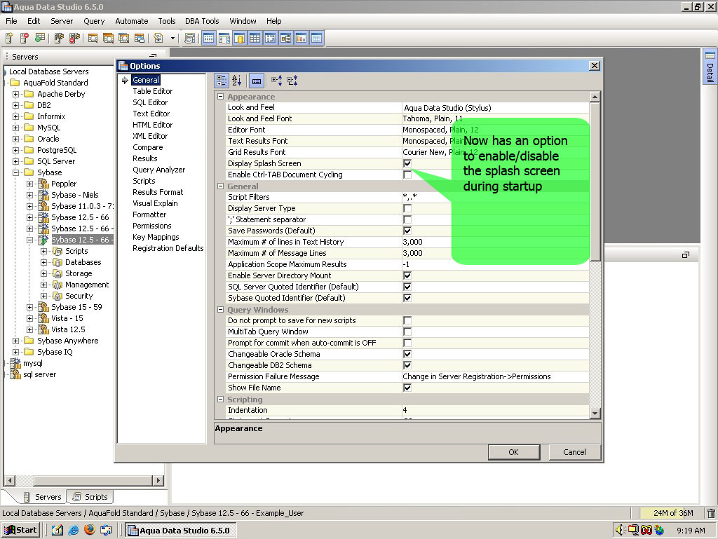 Added File->Options:General:Appearance:[Display Splash Screen] to give a user an option to enable/disable the splash screen for the application start. |
