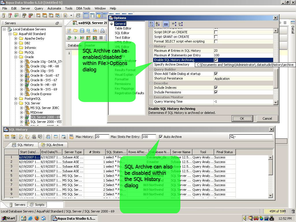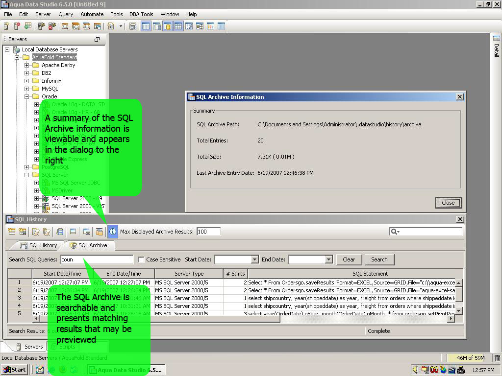 The SQL History now allows you to automatically archive SQL statements that are removed from the SQL History when the number of queries exceeds the defined maximum number. This option can be turned on and off, and an archive folder can be selected by a user in File->Options:General:History. Queries from SQL History may also be selected, manually moved and saved in SQL History Archive. A tab has been added to the SQL History window which allows a user to search through the archive by keyword and date, and present search results as a table which is similar to the current SQL History tab. The last selected search parameters are persistent across multiple runs of the application. If a search takes an extended period of time, a progress monitor pops up showing the operation progress. Diagram of how SQL History can be used for Audit Trail and SQL Query Analysis. SQL History Archives can be parsed and stored in a database for keeping a full audit trail of who did what on the database at what time. This can be valuable including for Sarbanes-Oxley compliance or any other regulatory requirements. |