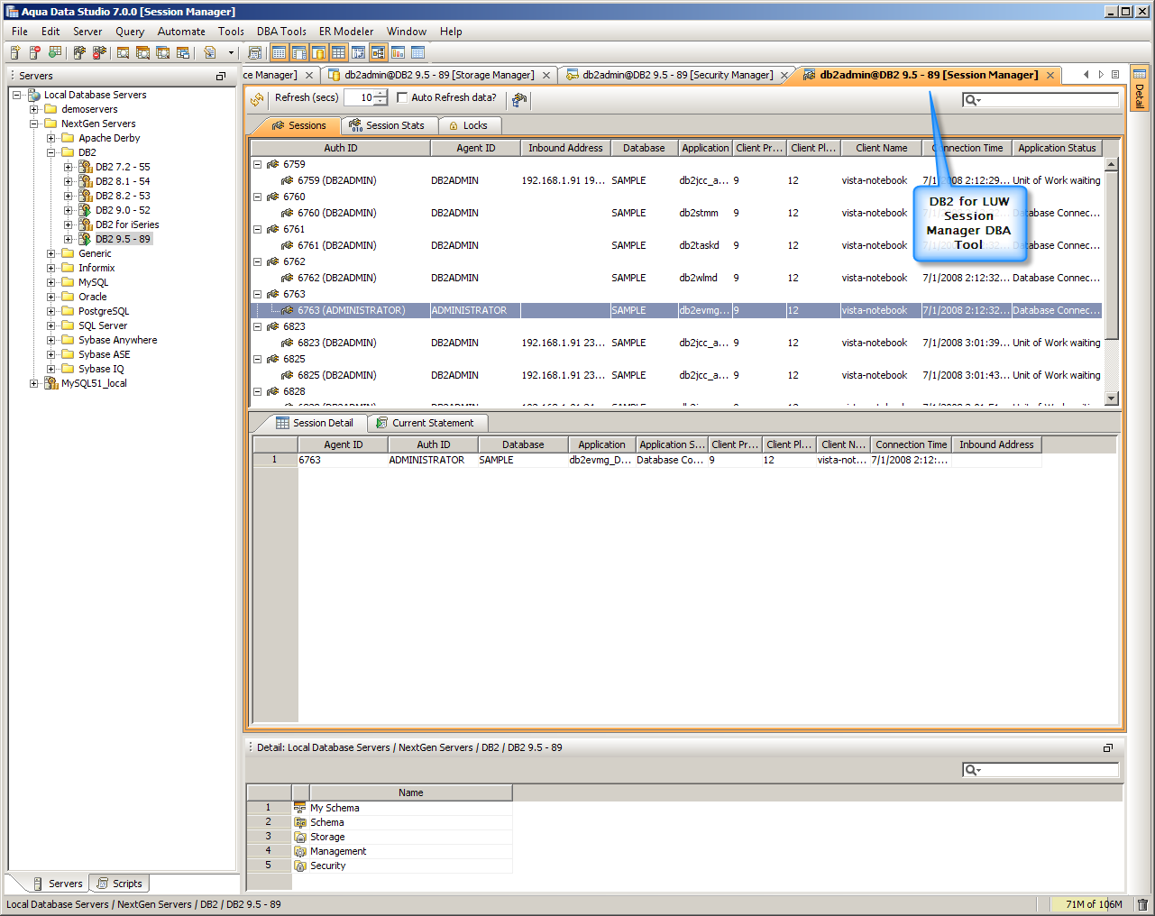 The Session Manager is also new for DB2 UDB. It is designed to help you manage database sessions, including user and system locks, and quickly identify locks and avoid unnecessary overheads. The following parameters are captured: