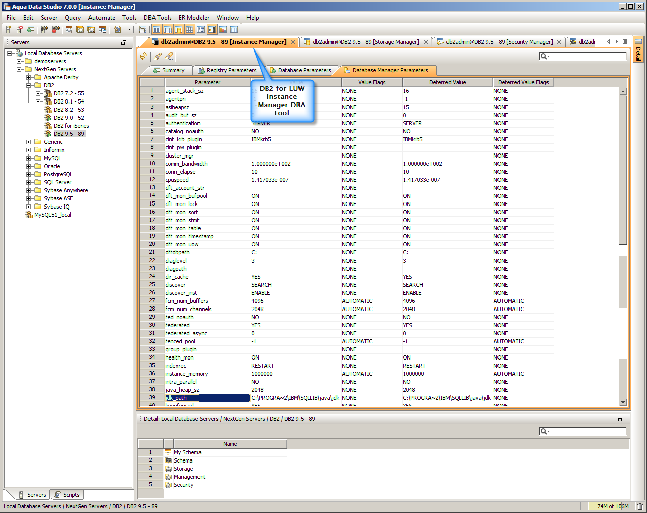 The Instance Manager provides a consistent interface to manage a DB2 for LUW server instance. You can quickly view and modify server parameters and server version information, including: