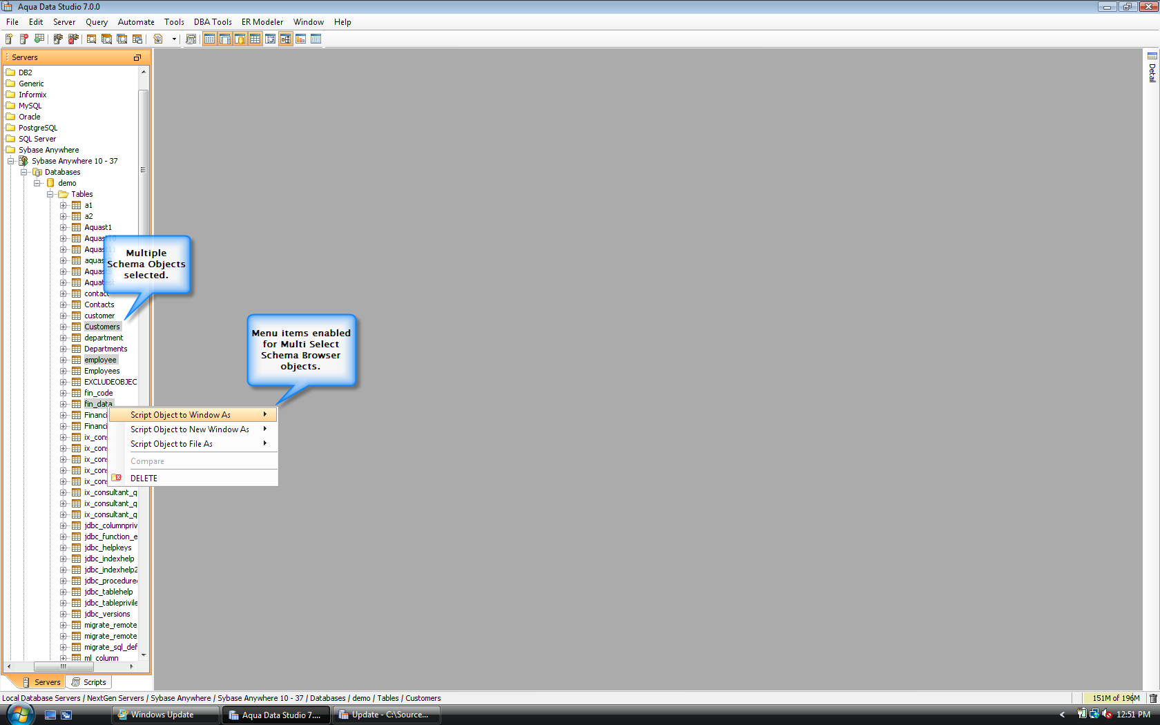 One of the most useful enhancements in Aqua Data Studio 7 is the ability to select multiple schema objects and quickly generate DDL CREATE and DROP statements to a query window. This feature even extends to multi-object DROPs. You can also preview multi-selected objects and sort or quick filter through the list before executing the operation.
