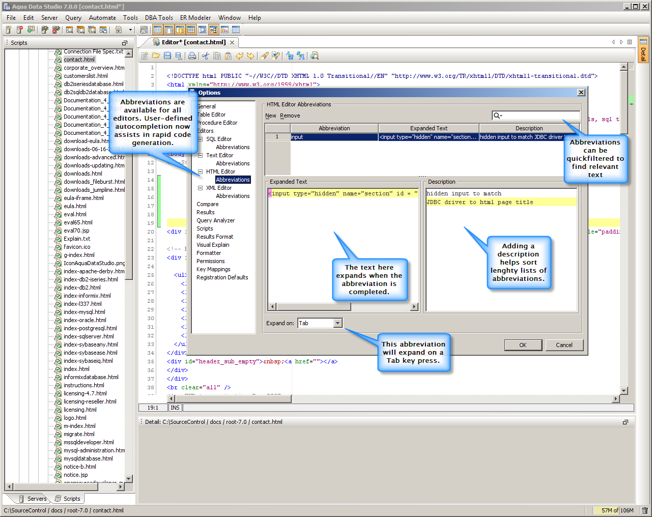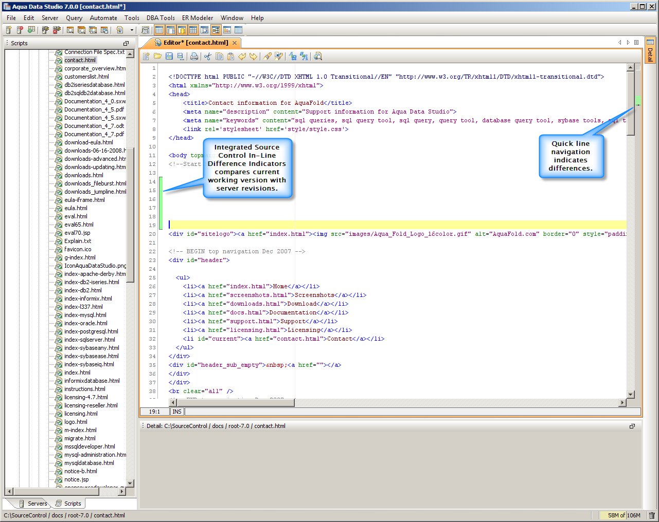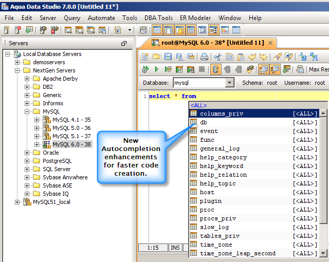 You spend a lot of time in the Aqua Data Studio editors, and in version 7 they work even better. Abbreviation and auto-completion support is included, as well as the ability to see in-line differences visually for version control.