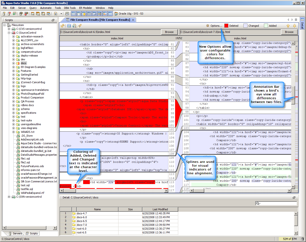 Character-level Compare Tools – Visual indicators let you see exactly what has changed down to the character level. You can also customize the highlight colors used to suit your needs. Learn more »