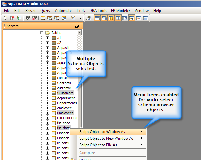 Multiple Selection – Select multiple database objects and perform the desired actions on all of them at once: SCRIPT, COMPARE and DELETE. This shortcut can really speed up scripting. Learn more
