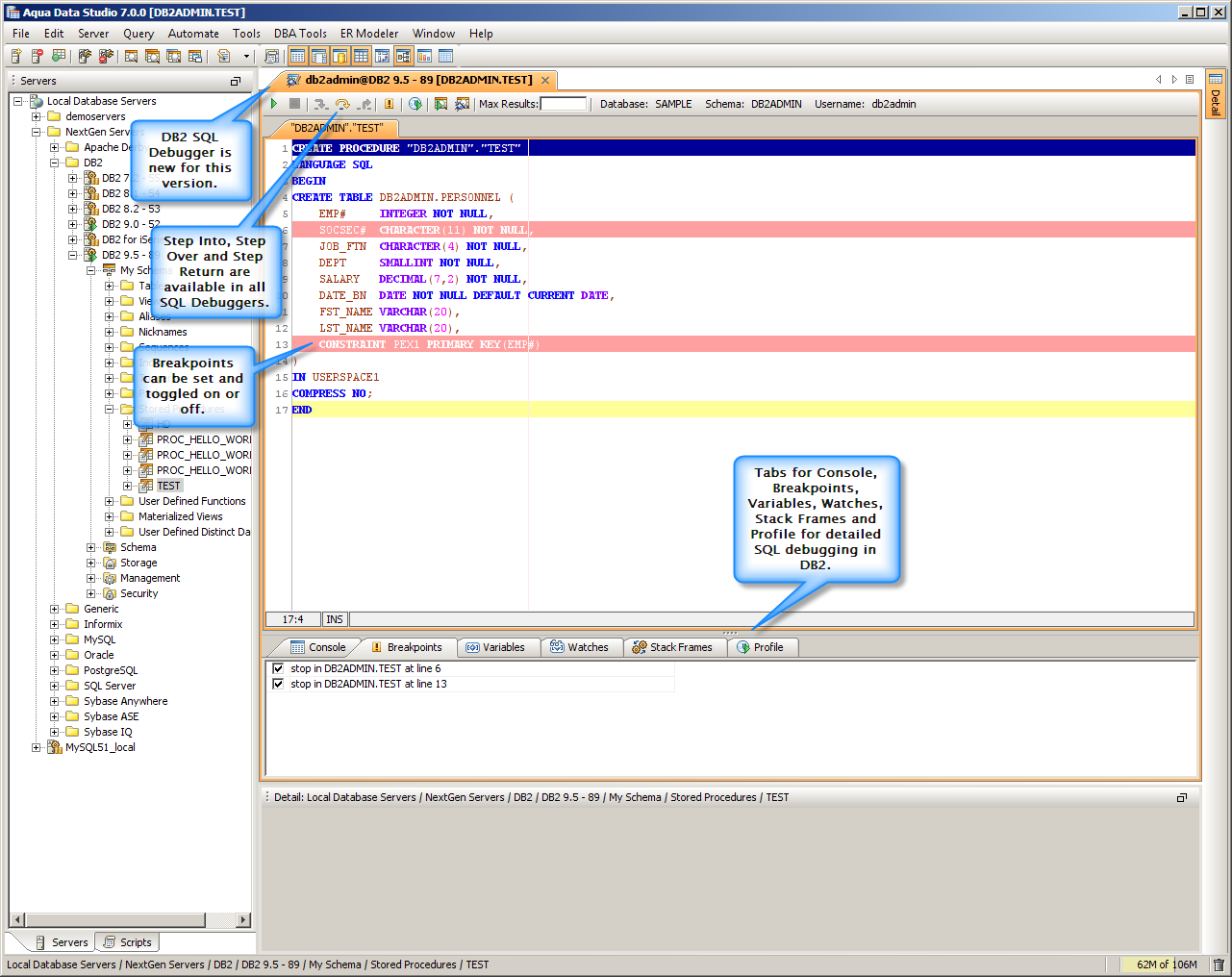 With support for DB2 for LUW, Aqua Data Studio 7 now offers debugging support for the top four enterprise databases. The new debugger provides the same consistent user interface you have come to know with our Oracle and Sybase debuggers. This allows you to use a common debugger across all the databases you interact with.