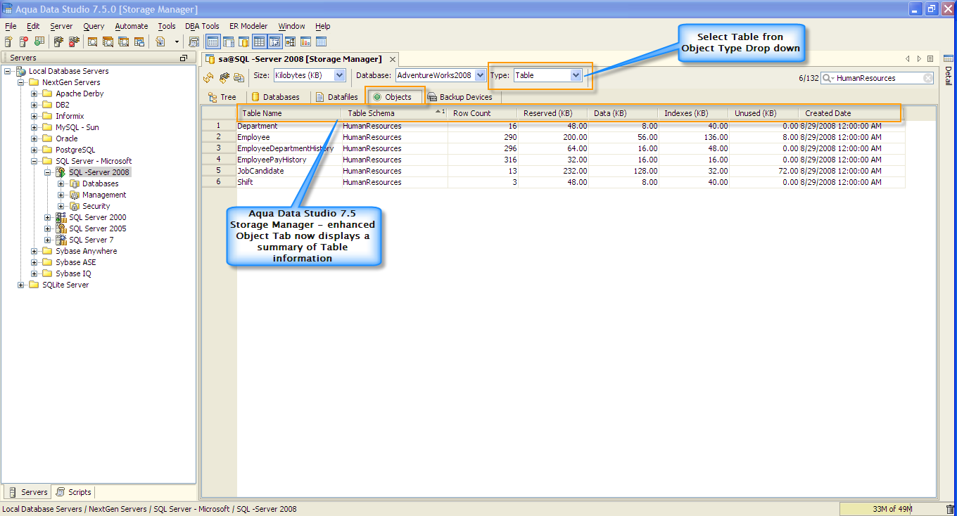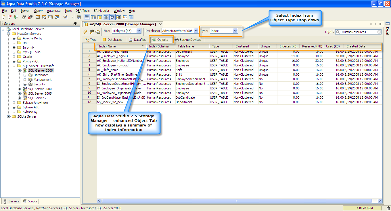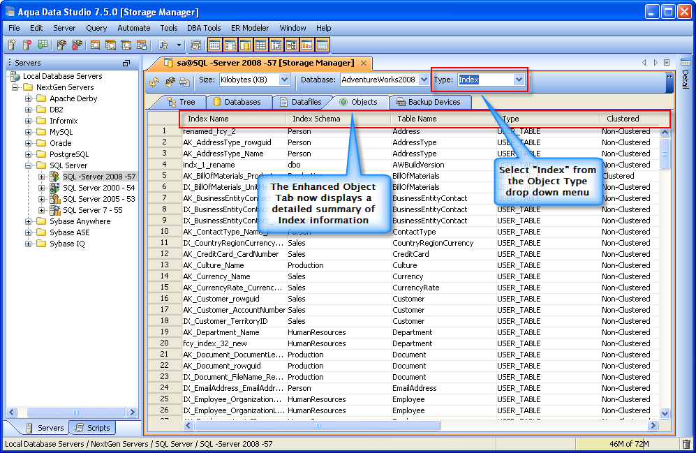Object Tab - Display of the Tables and Indexes.