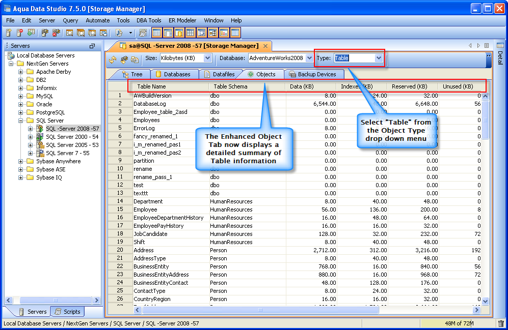 With the SQL Server Storage Manager you can now use the "Object" tab to view the storage information of table and indexes for capacity planning.
