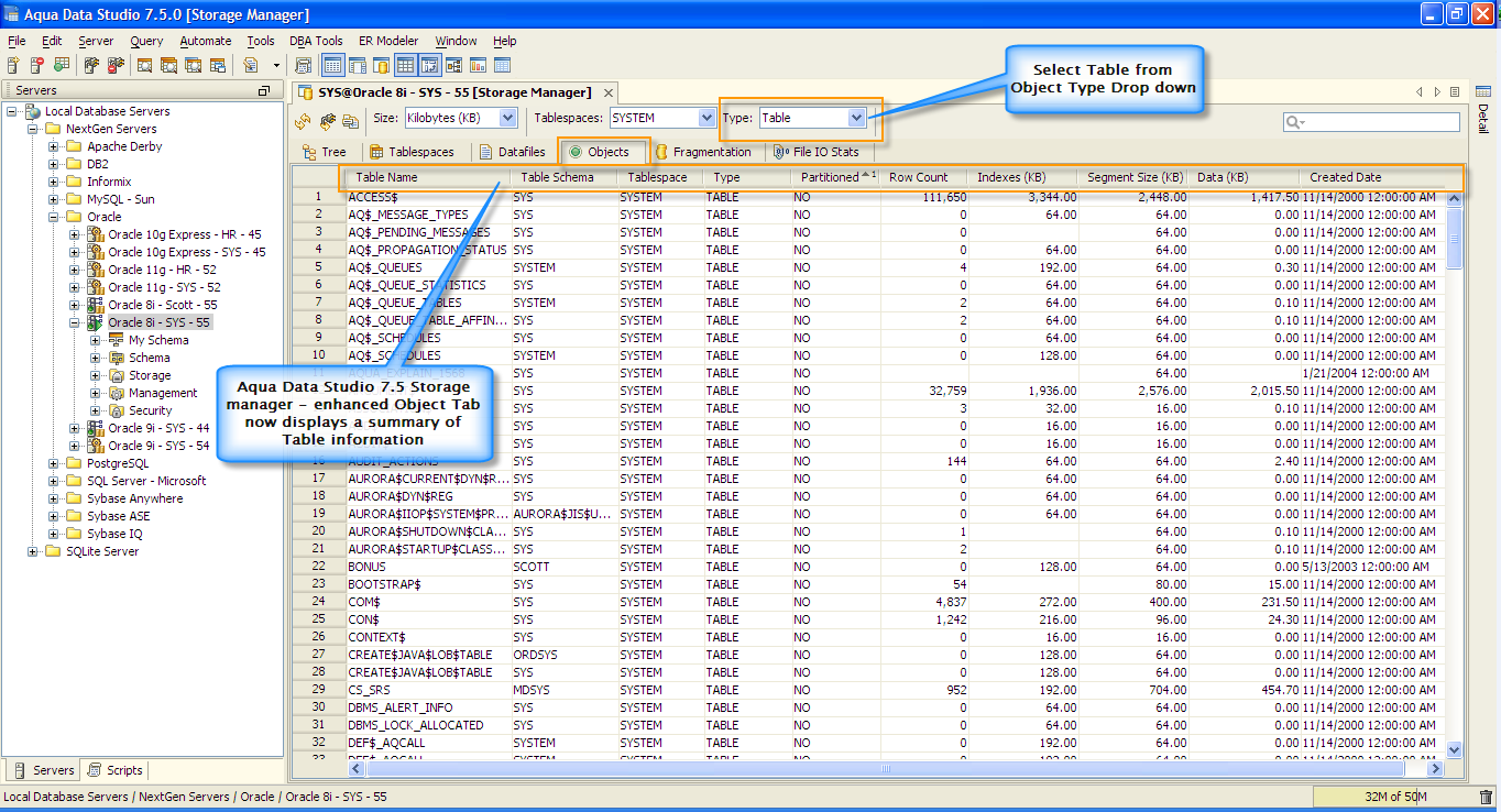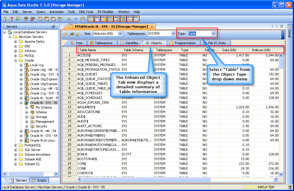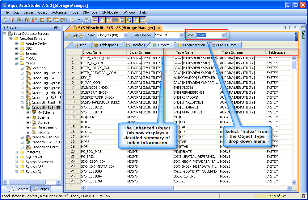 Object Tab - Display of the Tables and Indexes.