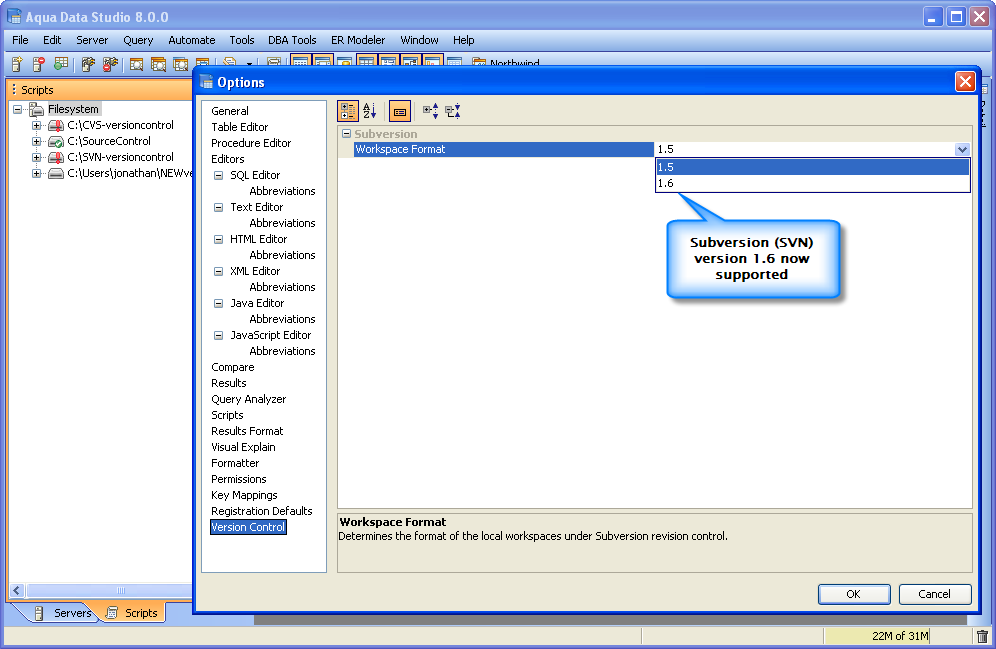 Added support for Subversion 1.6: Aqua Data Studio updated to SVNKit version 1.3.0. With this update, Aqua Data Studio allows use of Subversion Workspace Format version 1.6 for the local repository, or version 1.5 (the default).