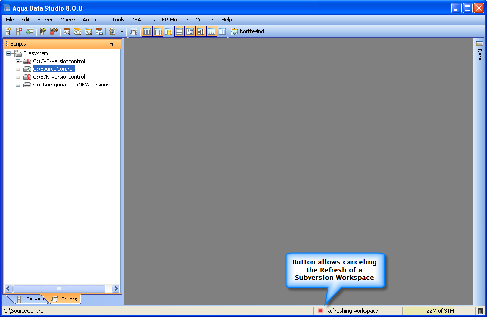 Cancel Workspace Refresh: An update to a repository refresh can now be canceled with a click on the cancel button at the bottom of the Main Application Window. This is useful in cases where refreshes begin consuming more memory than desired while other operations are taking place.