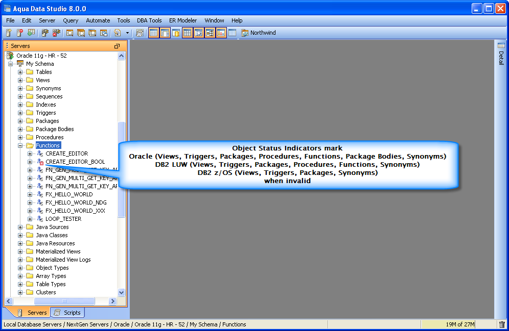 Schema Object Status: When the status of views, functions and procedures becomes invalid in Oracle, DB2 LUW and DB2 zOS, the Schema Browser icons for those objects changes to include a square red icon overlay. When the errors have been corrected, and the Schema Browser refreshed, the red overlay icon is removed indicating that the schema object is now valid. The icon overlays also appear in the Details View. Object status indicators mark Oracle (Views, Triggers, Packages, Procedures, Functions, Package Bodies, Synonyms) DB2 LUW (Synonyms, Functions, Packages, Procedures, Triggers, Views) and DB2 zOS (Synonyms, Packages, Triggers, Views) objects when invalid.