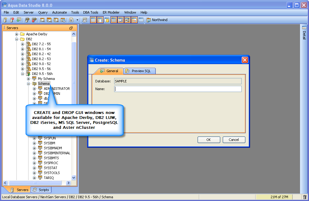 Create/Drop Schema GUI for : A new option to Create/Drop Schema is included for Derby, DB2 LUW, DB2 iSeries, MS SQL Server, PostgreSQL and nCluster